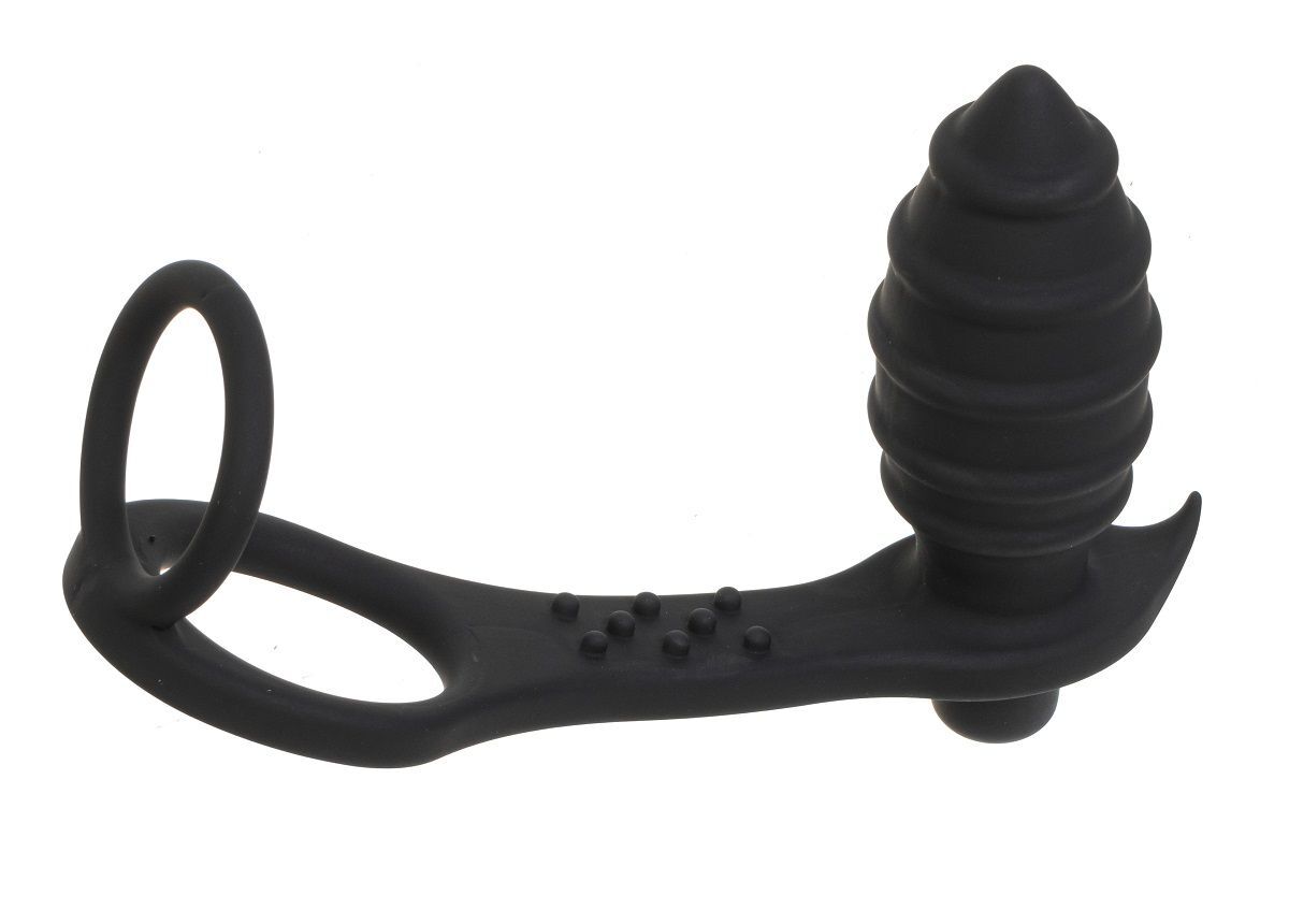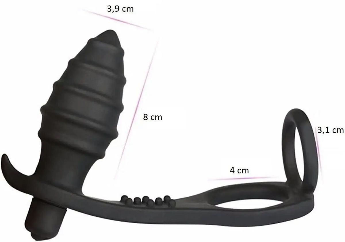 Черный анальный вибромассажер с эрекционными кольцами. Выполнен из софтач силикона. Анальная вибропробка покрыта ребрышками для лучшего воздействия на стенки ануса. Кольца отлично растягиваются - для плотной фиксации на стволе полового члена и мошонке. Длина пробки - 8 см., диаметр - 3,9 см. Диаметр колец - 4 и 3,1 см.