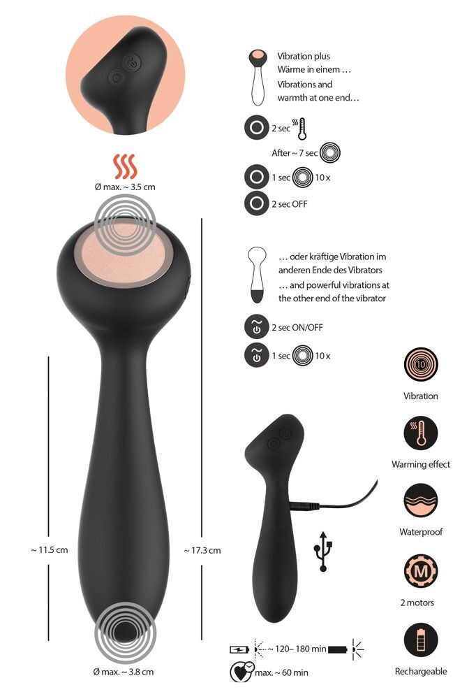 Вибратор Cupa Warming. Стимулируйте теплом и вибрацией! Согревающий вибратор, который можно использовать с обеих сторон для универсального ухода за телом и внутри него. С одной стороны тонкий, узкий вибратор для вагинального или анального введения. С другой стороны приплюснутый накладной вибратор с функцией нагрева для наружного массажа и целенаправленной стимуляции точек удовольствия. 2 мотора обеспечивают 10 режимов вибрации с каждой стороны, а также приятный нагрев. Каждый мотор можно удобно контролировать отдельно нажатием кнопки непосредственно на игрушке. Даже в/под водой, потому что сложная игрушка водонепроницаема. Рабочая длина - 11,5 см.