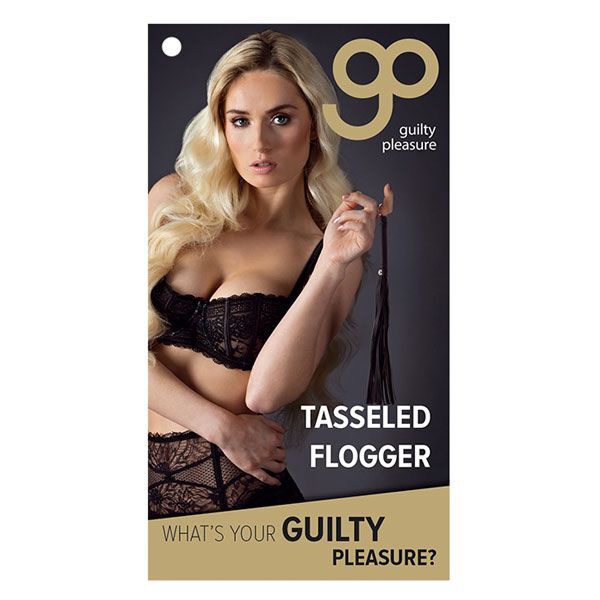 Черный флоггер с узкими лентами. Металлическое уплотнительное кольцо прикреплено к рукоятке для удобства использования. Длина ручки - 11 см.