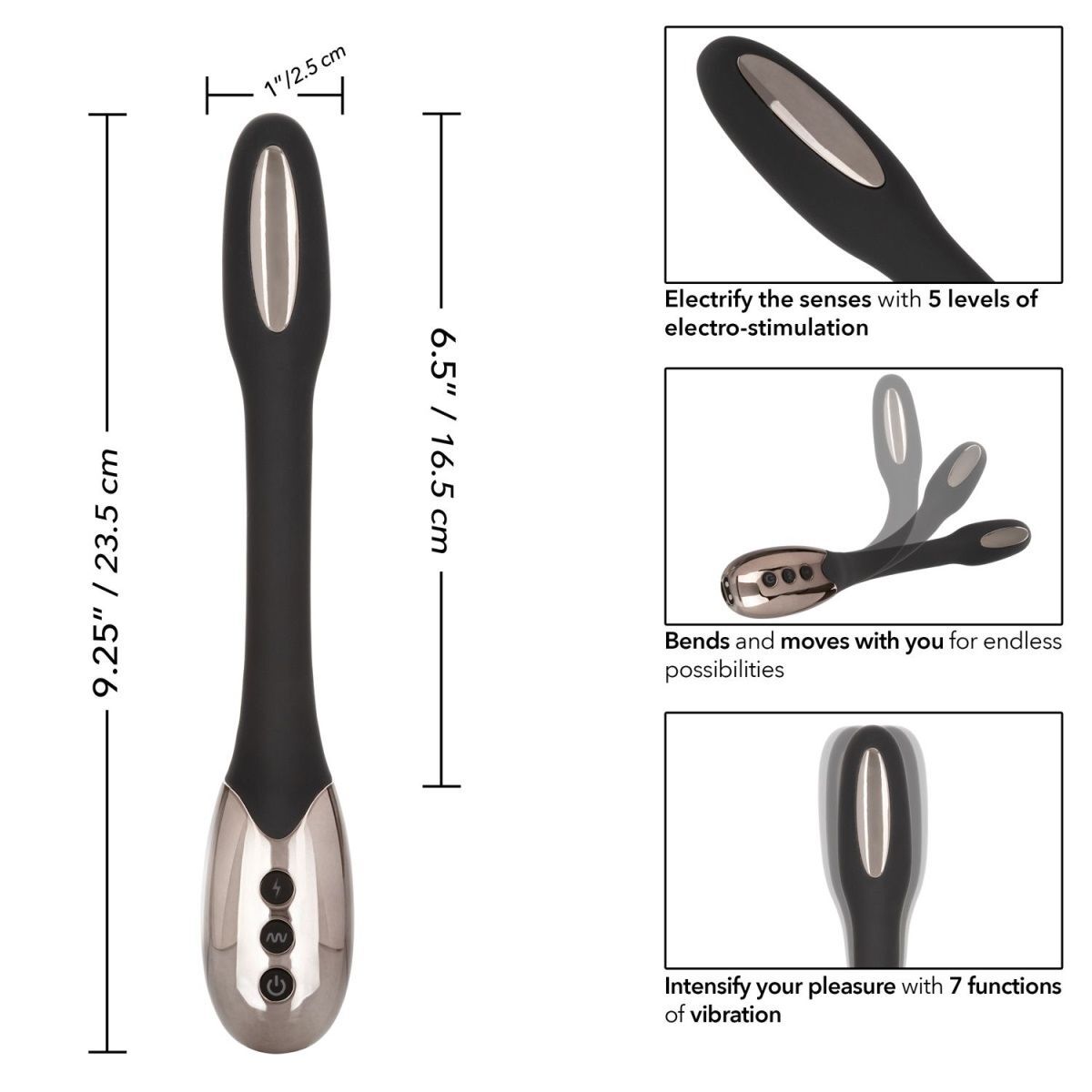 Electro-Spark- это уникально гибкий массажер для электростимуляции, который оснащен 5 независимыми функциями уровней электронной стимуляции и 7 функциями вибрации для наэлектризованного удовольствия. Тонкий и гибкий массажер можно согнуть практически в любом положении, обеспечивая пульсирующую стимуляцию под любым углом. Подушечки для электронной стимуляции из сплава без никеля работают, доставляя небольшие электрические импульсы в мышцы, ответственные за интенсивный оргазм и удовольствие. Стратегически расположенные электроды электростимуляции мягко пульсируют, усиливая ощущения и достигая кульминации. Только при использовании электростимулятора возможно достигнуть ощущений, которые нереально получить при физическом стимулировании интимных зон. Обратите внимание, что рекомендуется для расслабления сначала включать вибрацию, а после этого уже электростимуляцию. А также, что в воде можно использовать только вибрацию, электростимуляцию использовать категорически воспрещается. Для усиления эффекта и наиболее ярких ощущений можно использовать специализированный токопроводящий гель. Управление осуществляется с помощью трех встроенных в основание кнопок. Стимулятор заряжается через USB и может быть подключен практически в любом месте, просто подсоедините идущий в комплекте шнур к совместимому порту компьютера или USB-адаптера (приобретается отдельно), а противоположный конец к разъему у основания. Полная зарядка занимает 1 часа, ее достаточно для беспрерывной работы до 2 часов. Рабочая длина - 16,5 см. Минимальный диаметр - 2,5 см.