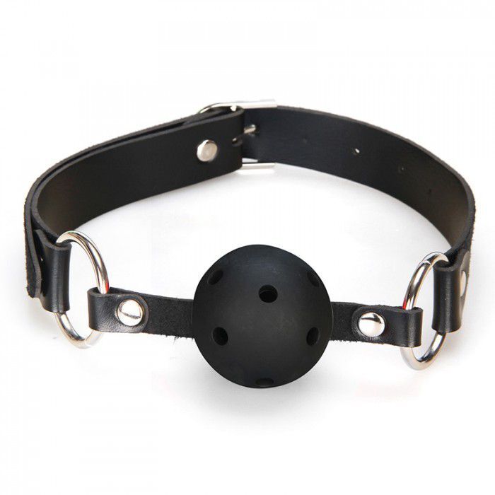 Черный кляп с пластиковым шаром с отверстиями для облегченного дыхания. Кляп застегивается на ремешок из искусственной кожи. Диаметр шарика - 4 см.