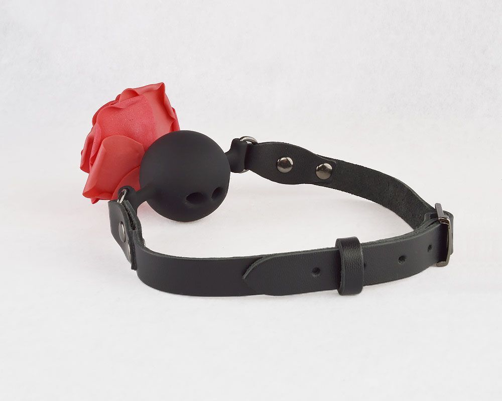 Кляп-шар изготовлен из силикона. Ремешки из натуральной кожи черного цвета. Фурнитура имеет никелевое покрытие. Роза изготовлена из фоамирана. Диаметр шара - 4,4 см.