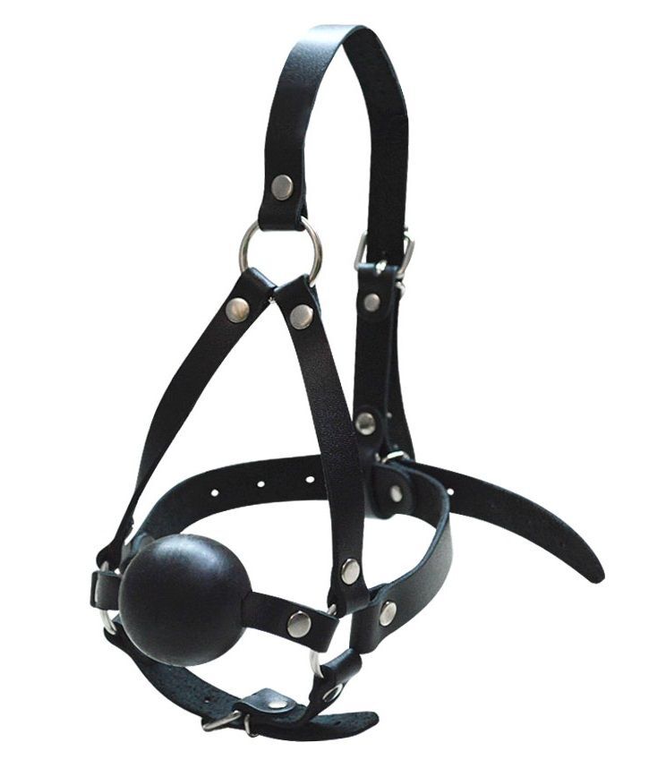 Черный кляп-шар со сбруей на голову из кожи