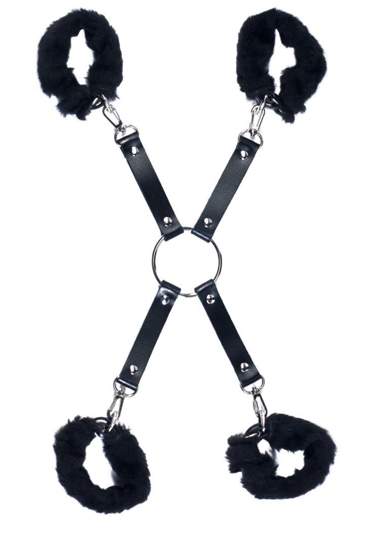 Набор для фиксации с четверным креплением, кольцом в центре и карабинами на концах. Особенности: - черная натуральная кожа (1.8-2 мм), 1 слой - черный съемный искусственный мех - набор 2 в 1: можно использовать с мехом для нежной фиксации, или снять мех и получить более жесткую версию - удлиненные размеры ремней для ног и для рук - соединение - металлическое кольцо к которому на кожаных ремешках прикреплены карабины - никелированная металлическая фурнитура - размеры регулируются пряжкой.