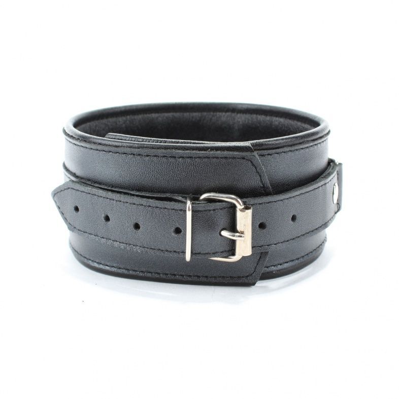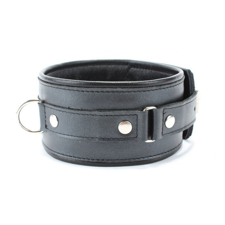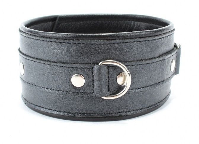 Ошейник выполнен из натуральной гладкой кожи черного цвета. Ремень позволяет выбрать нужный размер, подойдет на обхват от 26 до 40 см. Металлическая пряжка надежно фиксирует аксессуар. Ошейник декорирован металлическим полукольцом спереди, заклепками по периметру. Мягкий подклад обеспечивает комфорт, помогая полностью погрузиться в БДСМ игру. Ширина - 6 см.