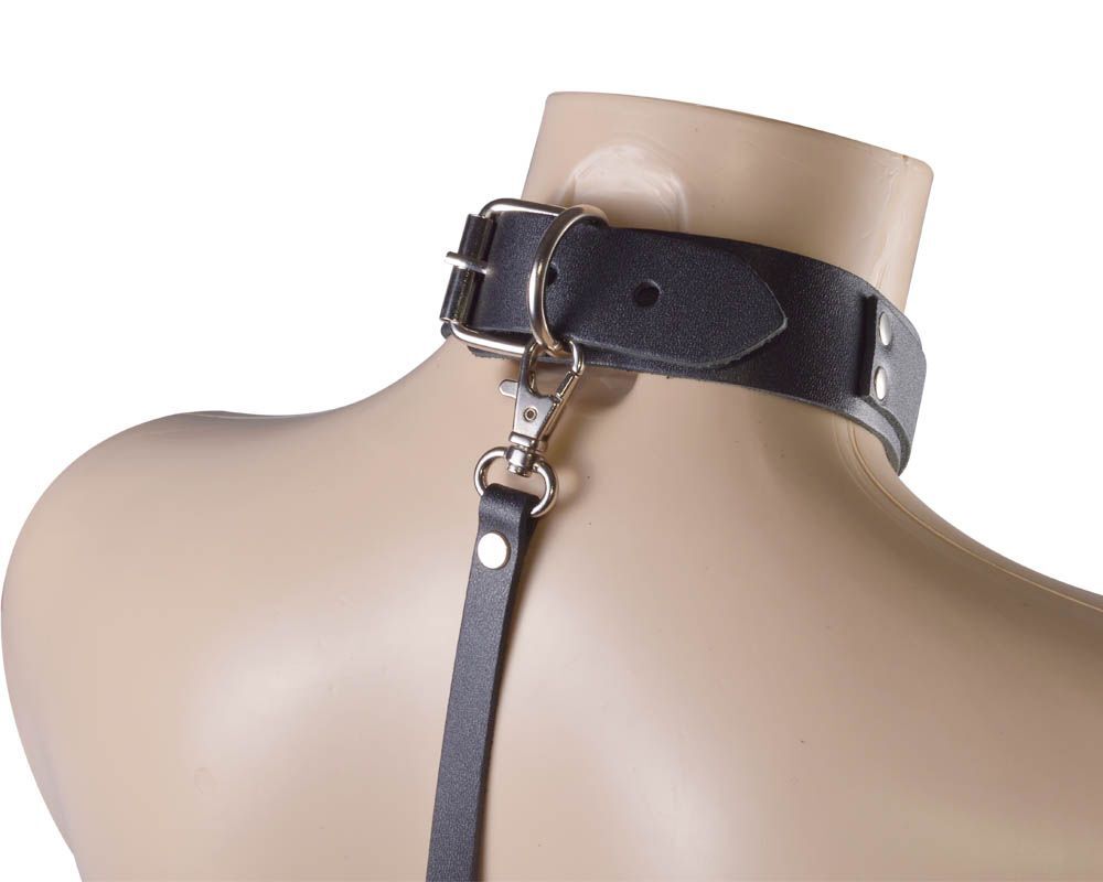 Ошейник с зажимами на соски изготовлен из натуральной кожи с применением никелированной фурнитуры, декорирован клепками. Регулируется ошейник при помощи пряжки, что позволяет оптимально подобрать размер. Зажимы оснащены пружинным механизмом, за счет чего легко и удобно фиксируются на месте, винтики позволяют отрегулировать степень давления в соответствии с индивидуальными предпочтениями. Поводок кожаный. Ширина ошейника - 3 см. Длина металлической цепочки - 40 см.