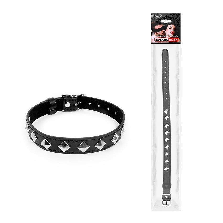 Оригинальный ошейник для любителей БДСМ-игр, декорированный металлическими украшениями. Имеет возможность регулировки размера с помощью ремешков. БДСМ-аксессуар прост в применении, не требуют специального ухода.
