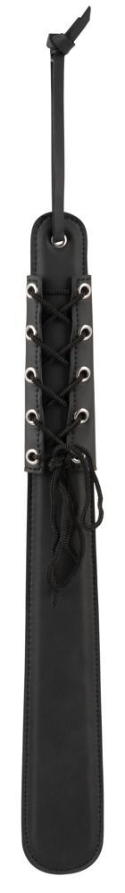 Модель сочетает в себе оригинальный дизайн и эргономичную форму. Стильная шлепалка с широкой пластиной для нанесения ударов изготовлена из мягкого полиуретана и имеет удобную петлю для руки, а ее массивная рукоять украшена велюром и шнуровкой. Для дополнительной прочности края девайса прошиты нитью.