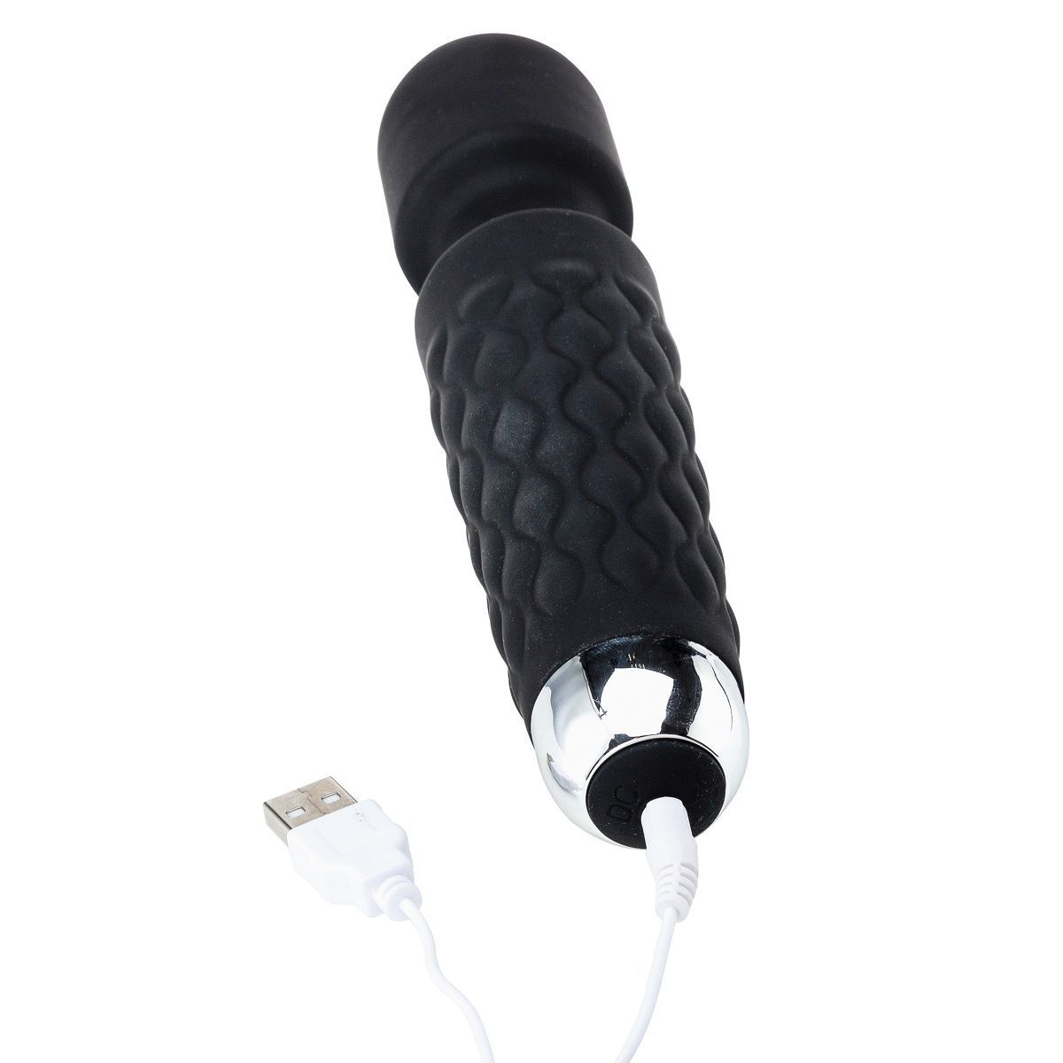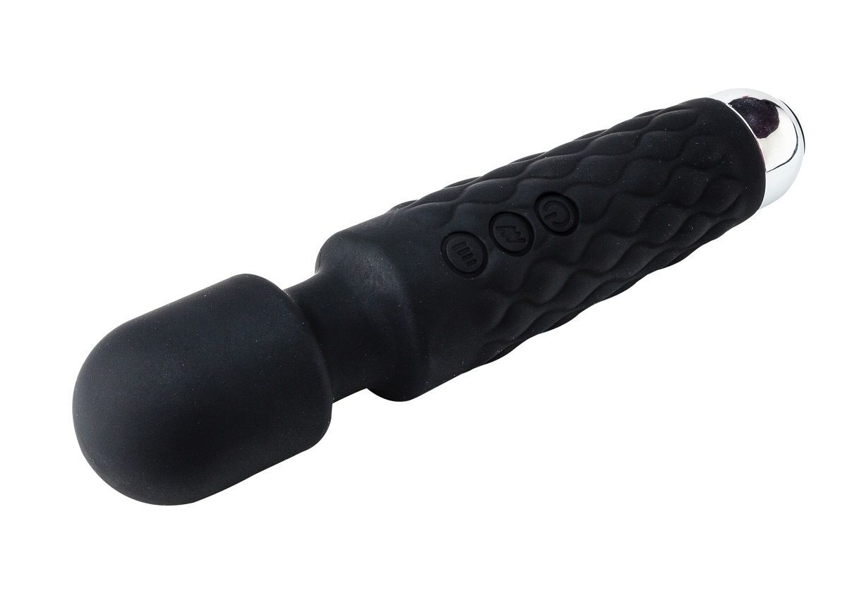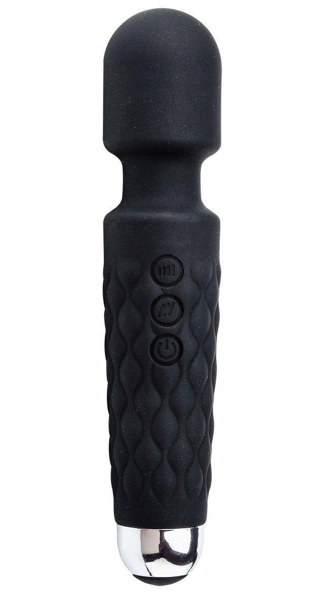 Черный перезаряжаемый wand-вибратор. Имеет 20 режимов вибрации и 8 режимов интенсивности вибрации. Выполнен из нежнейшего силикона. Водонепроницаемый. Поставляется с мешочком для бережного хранения.