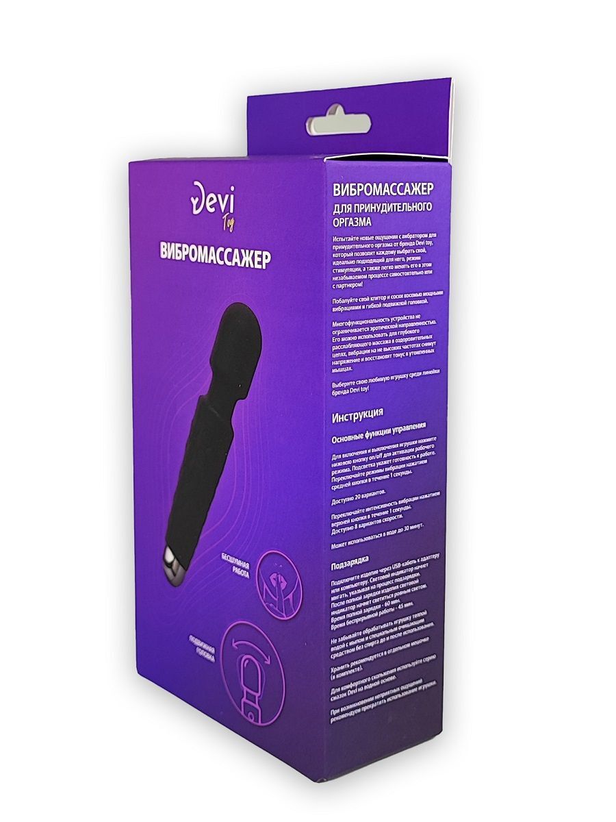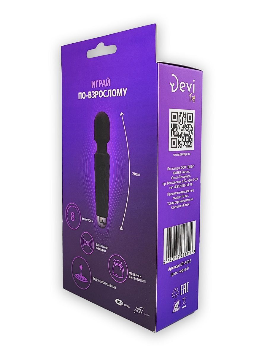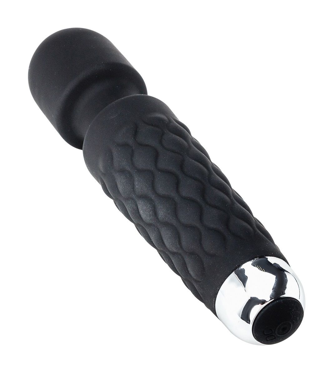 Черный перезаряжаемый wand-вибратор. Имеет 20 режимов вибрации и 8 режимов интенсивности вибрации. Выполнен из нежнейшего силикона. Водонепроницаемый. Поставляется с мешочком для бережного хранения.