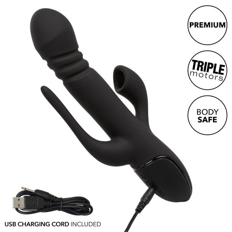III Triple Euphoria - вибромассажер с тройной стимуляцией! Этот вибратор имеет 3 мощных двигателя и обеспечивает 3 скоростями поступательного движения основного ствола, 10 функциями вибрации анальной зонда и 10 функциями всасывания клиторального отростка. Игрушка может одновременно стимулировать вагинальную, анальную и клиторальную зоны. Стимуляция на отростках может работать одновременно и по отдельности. Вибромассажер изготовлен из гипоаллергенного мягкого силикона премиум-класса безопасного для тела, не содержащего фталатов, обеспечивающего приятные и гарнировано безопасные тактильные ощущения. Идеально подходит для вагинальной, анальной и интенсивной клиторальной стимуляции. Для комфортности введения и получения максимально приятных ощущений рекомендуем использовать смазку на водной основе. Управление осуществляется с помощью трех встроенных в основание кнопок. Чтобы включить или выключить игрушку, необходимо нажать и в течении трех секунд удерживать верхнюю кнопку питания. Имеется функция запоминания последнего выбранного сочетания. Доступна возможность блокировки, которая позволит предотвратить самопроизвольное включение игрушки во время путешествий. Вибромассажер заряжается через USB и может быть подключен практически в любом месте, просто подсоедините идущий в комплекте шнур к совместимому порту компьютера или USB-адаптера (приобретается отдельно), а противоположный конец к разъему у основания. Полная зарядка занимает 2,5 часа, ее достаточно для беспрерывной работы на высокой мощности в течение 45 мин, а на низкой – 1,5 часа. Рабочая длина - 14 см. Длина анального отростка - 9 см., диаметр - 0,75 см.