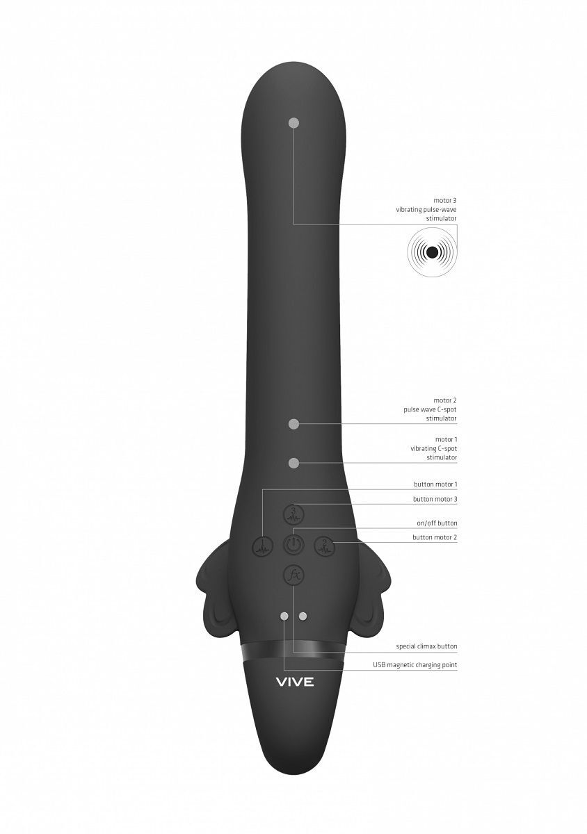 Satu – это безремневой страпон, который взял все самое лучшее от вибраторов линейки VIVE. Оснащен 3 мощными независимыми моторами: 2 импульсно-волновых в головке вибратора по одному для каждого партнера для активной стимуляции точки G/P, вибрационный мотор клиторальном отростке. При этом Satu достаточно тихий, не смотря на всю его мощь. Изготовлено изделие из шелковистого медицинского гипоаллергенного силикона и как большинство моделей линейки VIVE имеет кнопку мгновенного оргазма, запуская все моторы на максимум одним касанием. Такой вибратор можно брать с собой в ванную и душ. Рабочая длина - 13 см.
