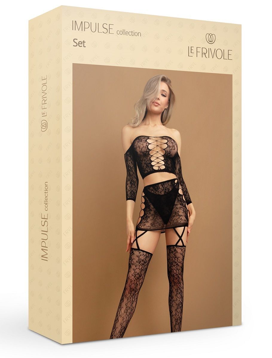 Данная модель - уникальный симбиоз желаний. Тот вариант, когда хочется максимальной экстравагантности, приправленной щепоткой кокетства, и без единого намёка на вульгарность. Нежное кружево деликатно черного цвета облегает каждый соблазнительный изгиб тела, единая концепция чулок и юбки интригует, разжигая интерес и желание прикоснуться. Узоры и сетка верхней части костюма, подобно вечернему платью, позволяют демонстрировать изящество линии ключиц, и красоту шеи. Этот комплект также дарит возможность ношения по отдельности как топа, так и чулок с юбкой, сочетая их с другими предметами одежды и аксессуарами. Особый состав и плетение не сковывает движения и не перетягивает тело, а значит вам будет комфортно! В комплекте: топ, юбка с чулками.
