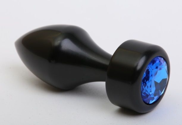 Чёрная анальная пробка с широким основанием и синим кристаллом - 7,8 см.