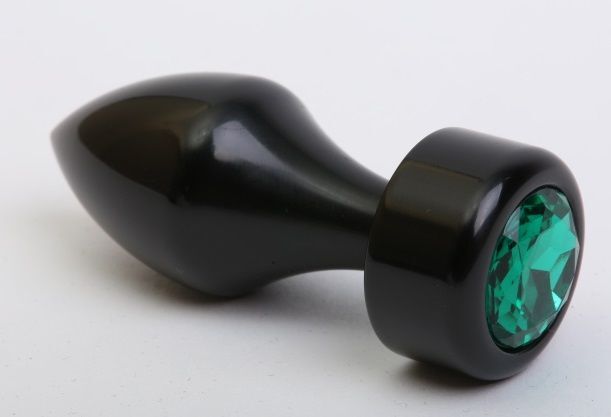 Чёрная анальная пробка с широким основанием и зелёным кристаллом - 7,8 см.