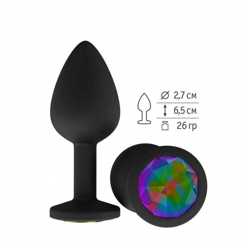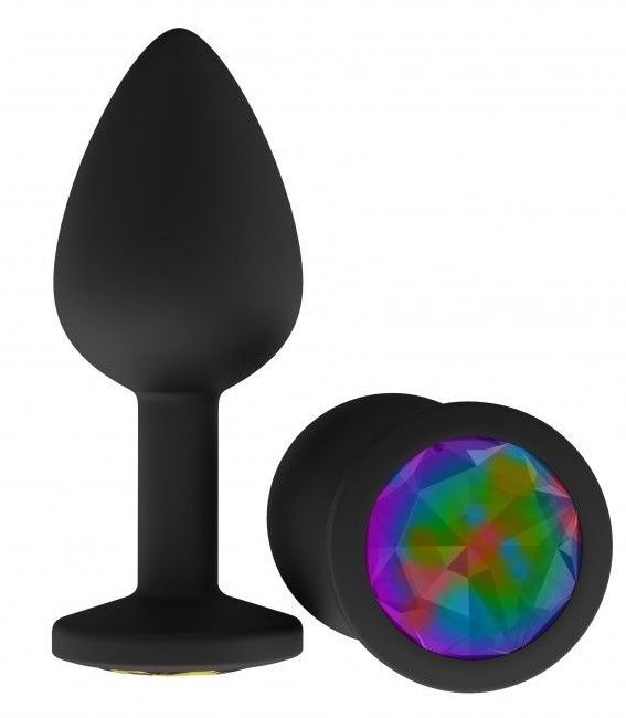 Чёрная анальная втулка с разноцветным кристаллом - 7,3 см.