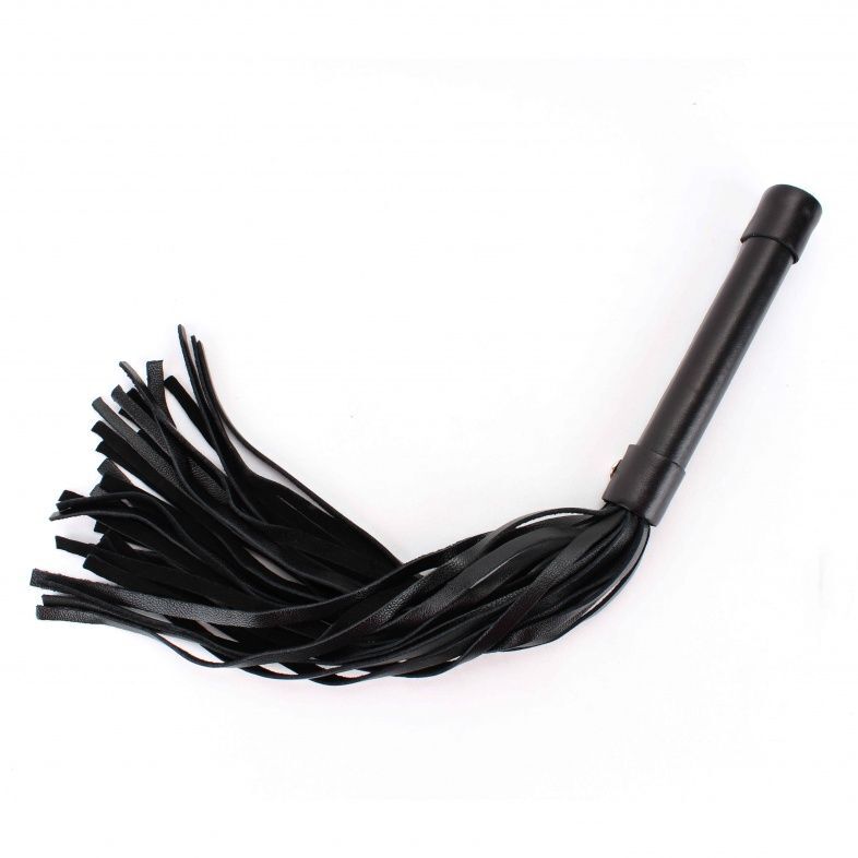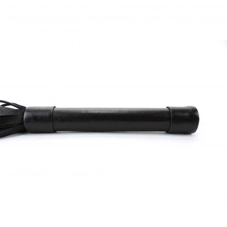 Плеть выполнена из натуральной кожи черного цвета. Ручка из натуральной гладкой кожи. Хвосты выполнены из нежной перчаточной натуральной кожи, количество хвостов - 23 штуки. Стильная плеть поможет воплотить эротические фантазии в реальность. Длина ручки - 17 см., диаметр - 2,5 см.