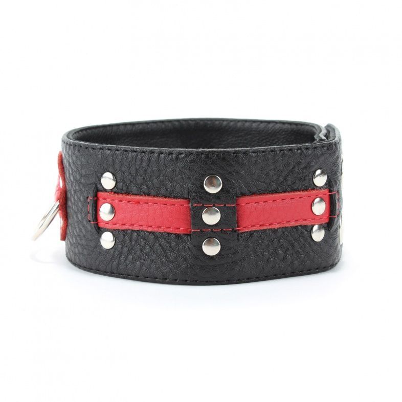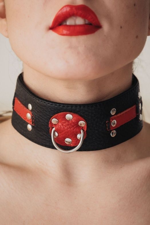 Ошейник выполнен из натуральной кожи черного цвета, декорирован вставками из красной кожи, заклепками. Ошейник фиксируется металлическими кнопками, позволяющими подобрать нужный размер, подойдет на обхват от 31 до 36 см. Подклад из нежной кожи обеспечивает комфорт. Стильный аксессуар поможет воплотить самые смелые фантазии фантазии в реальность. Ширина ошейника - 5 см.