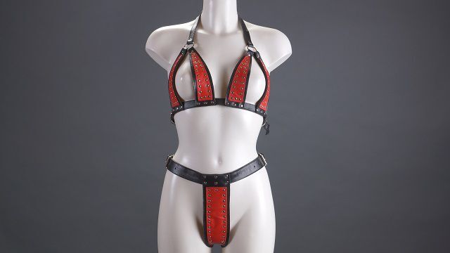 Одежда в стиле БДСМ способна создать особое настроение и разнообразить сексуальную жизнь. Представленный комплект состоит из лифа и стрингов, выполнен из натуральной кожи в красно-черной цветовой гамме. Ремешки позволяют отрегулировать размер комплекта. В комплекте: лиф, трусики-стринг.