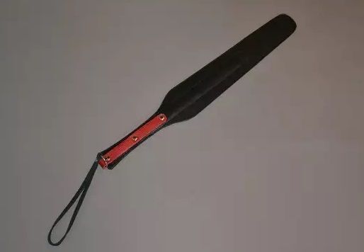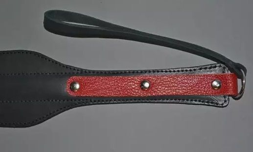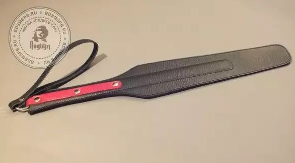 Спанкер выполнен из чёрной матовой кожи в форме «лопатки». Пружинящая вставка из полимерного материала придает спанкеру гибкость. Используется для работы по ягодицам и по верхним мышцам внутренней стороны бедра. Рукоять украшена вставкой из красной кожи и фурнитурой. Проста в применении и безопасна. Во избежании травм не рекомендуется наносить удары ребром. Ручная работа. Ширина ударной части - 6,5 см. Длина ударной части до рукояти - 30,5 см.