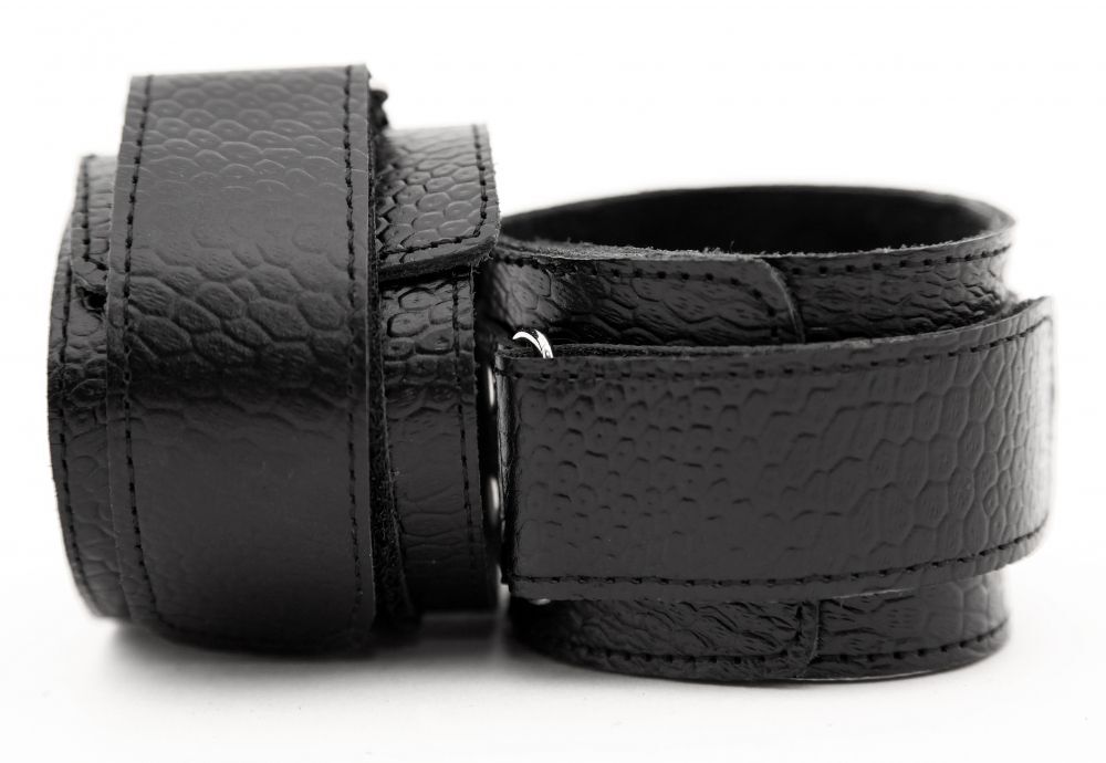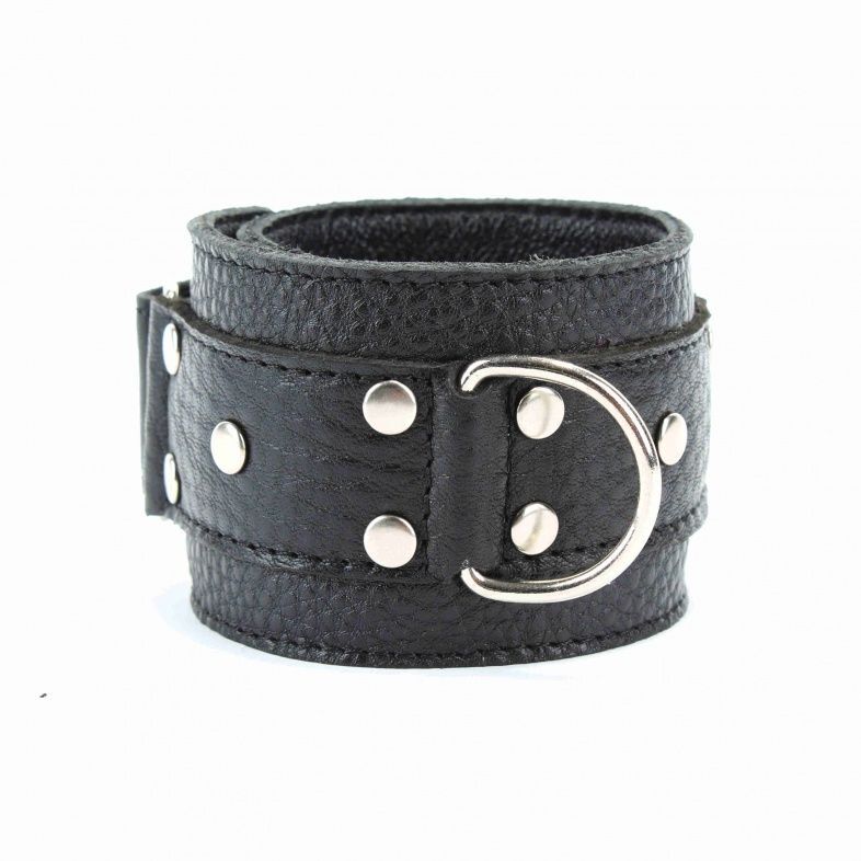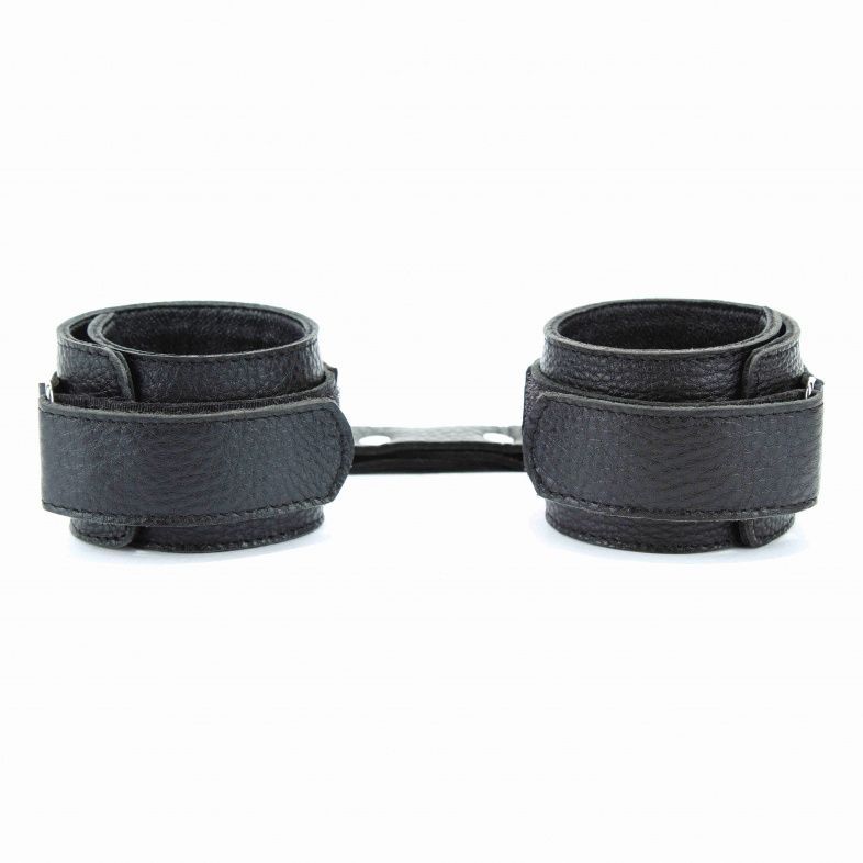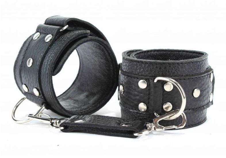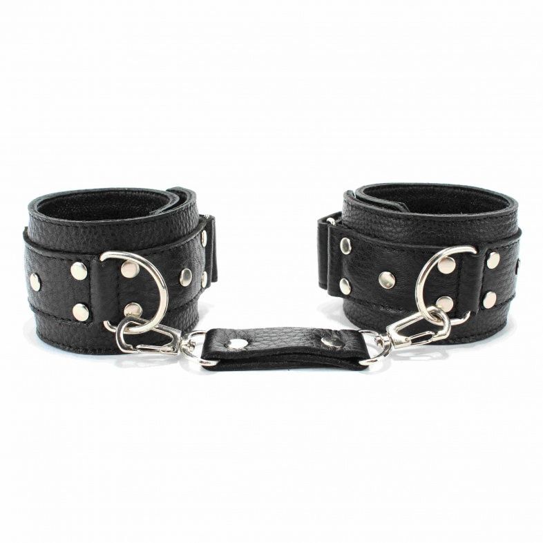 Кожаные наручники черного цвета. Украшены заклепками и соединяются между собой цепью с карабинами. Размер наручников регулируется при помощи застежки-липучки. Подойдут на обхват руки от 15 до 20 см. Ширина - 5 см. Длина цепочки - 14 см.