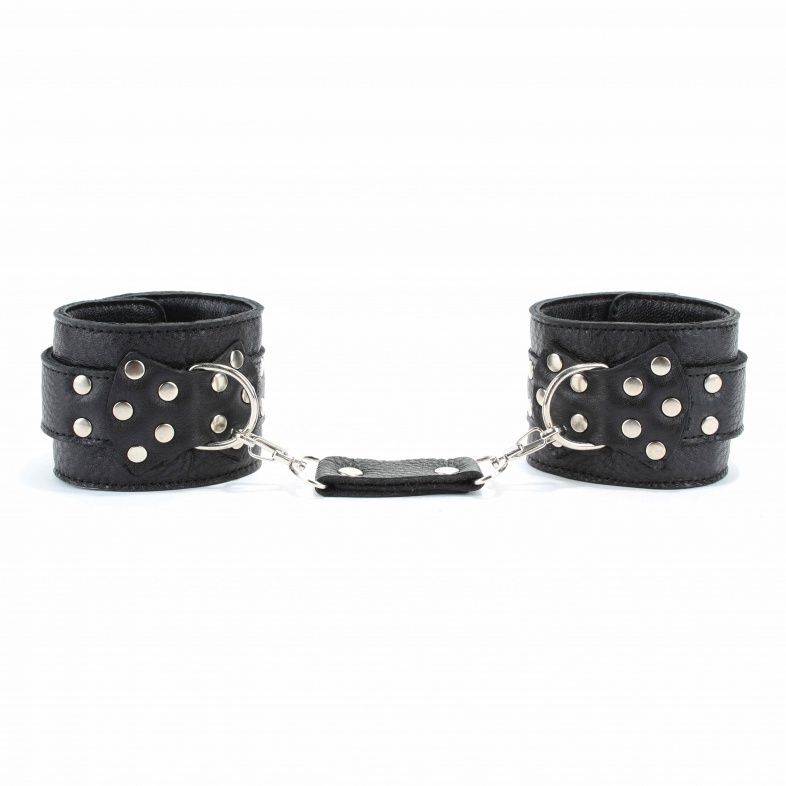 Оковы выполнены из натуральной кожи черного цвета. Декорированы заклепками и бантом с металлическим полукольцом. Оковы надежно фиксируются пряжками и ремнями, позволяющими выбрать нужный размер, подойдут на обхват от 18 до 27 см. Нежный подклад из перчаточной кожи обеспечивает комфорт, кожаное соединение на карабинах фиксирует оковы вместе. Аксессуар позволяет в полной мере насладиться сексом в стиле БДСМ. Ширина - 6 см. Длина цепочки - 14 см.