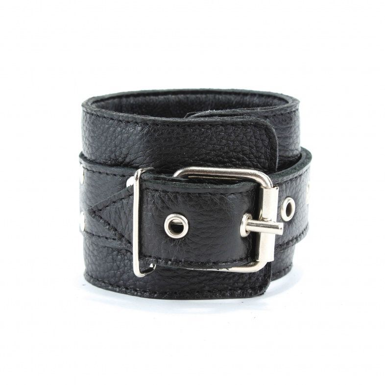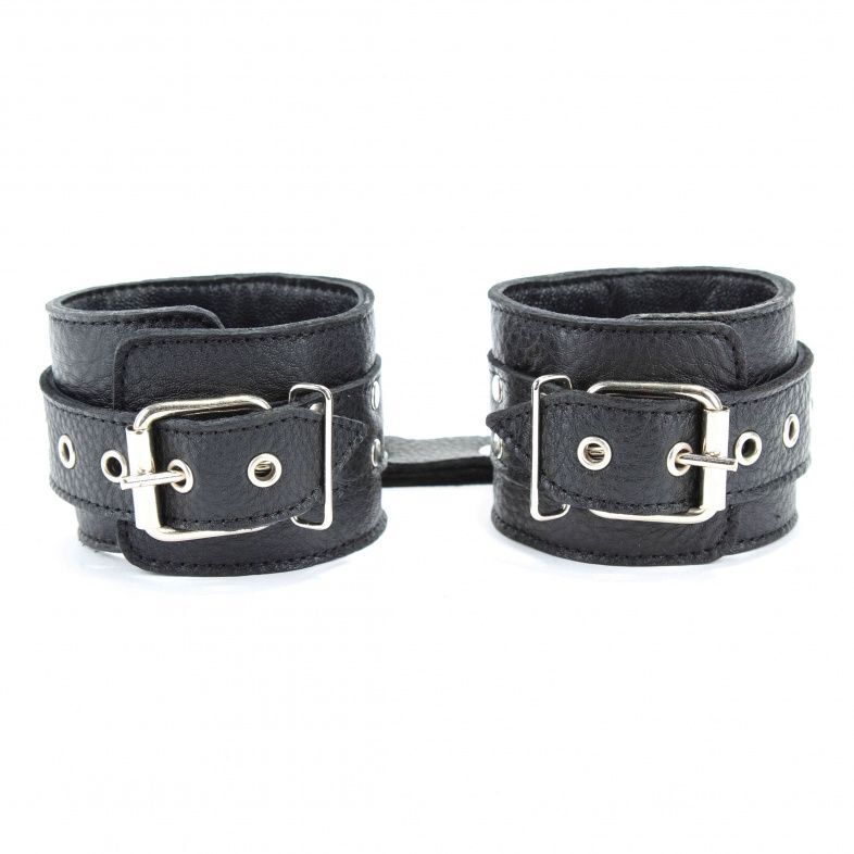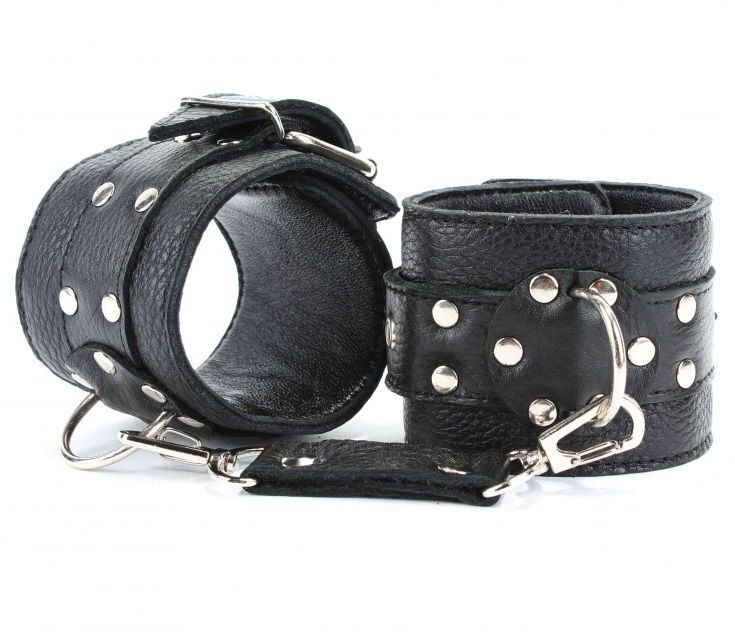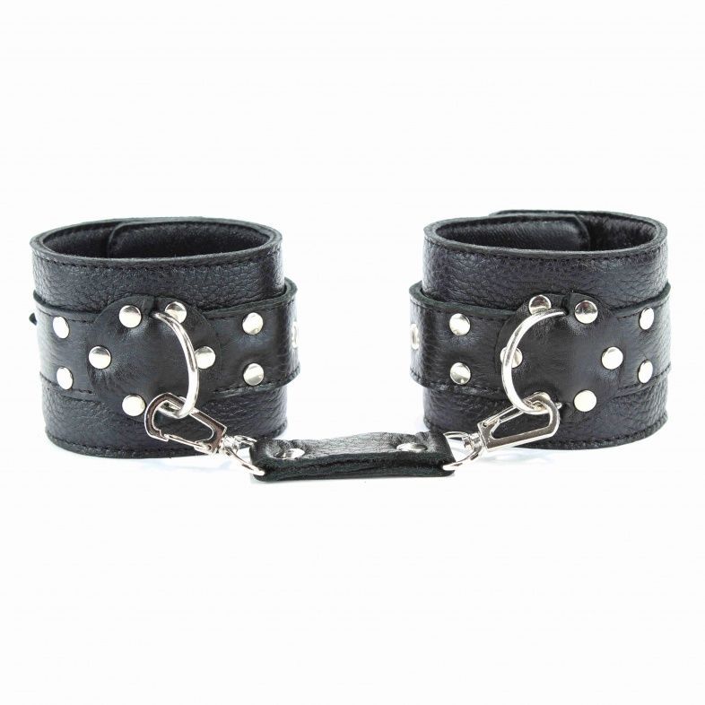 Наручники выполнены из натуральной кожи черного цвета. Изделие декорировано заклепками. По середине расположено полукольцо из сварной фурнитуры. Наручники надежно фиксируются пряжками и ремнями, позволяющими выбрать нужный размер, подойдут на обхват руки от 16 до 25 см. Кожаное соединение на карабинах фиксирует наручники вместе. Приятные для тела и стильные наручники отлично подходят для воплощения эротических БДСМ игр. Ширина - 6 см. Длина соединения - 14 см.
