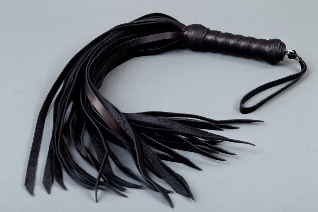 Флоггер-плеть изготовлен из натуральной плотной кожи. Флогер средней жесткости представляет собой рукоять-трубку, обмотанную полосой кожи черного цвета с декоративными элементами и хвосты из натуральной кожи. Ручная работа. Длина хвоста - 50 см.
