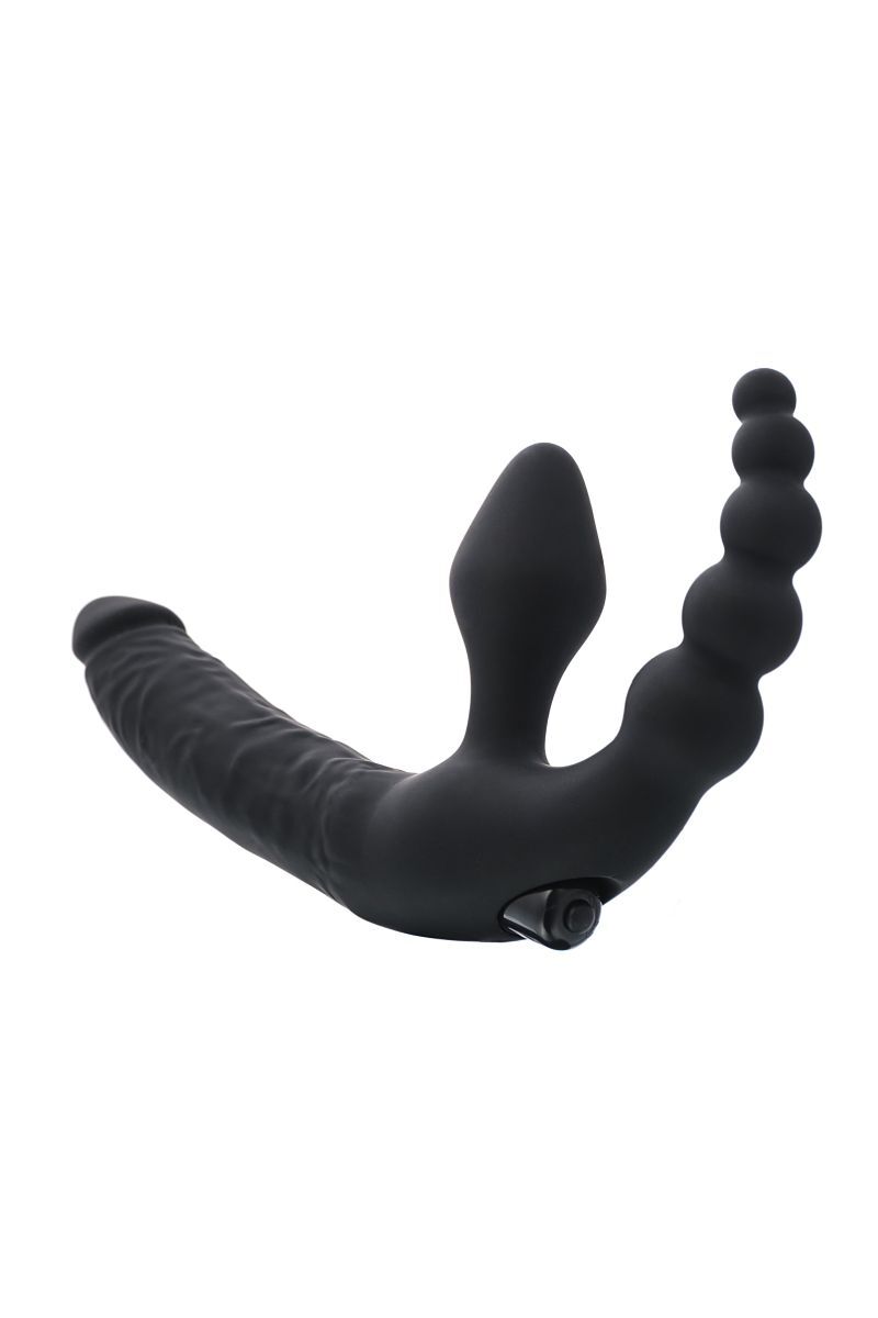 Этот анатомический страпон готов доставить уникальное удовольстие обоим партнерам: его обладательница испытает удовольствие от одновременной вагинальной и анальной стимуляции, а партнер(ша) от проникновения вибратора, расположенного под идеальным углом для достижения высшей точки наслаждения. Рабочая длина - 15 см. Длина вагинальной пробки - 7 см., диаметр - 3 см.
