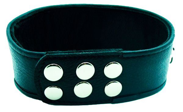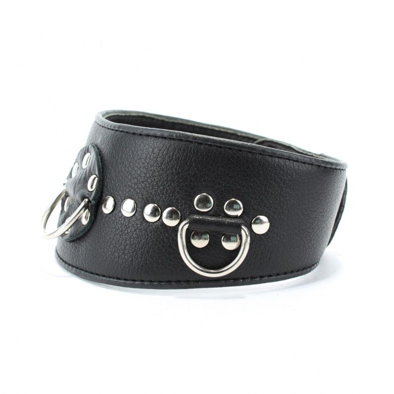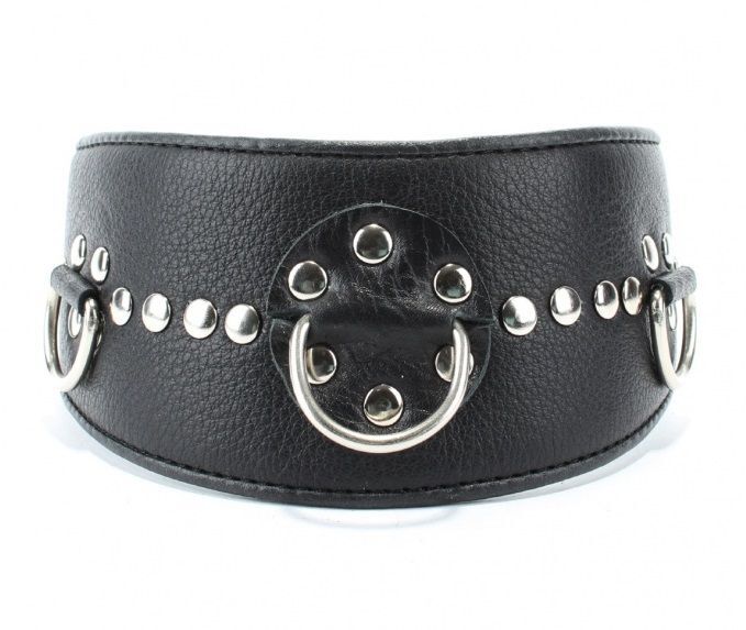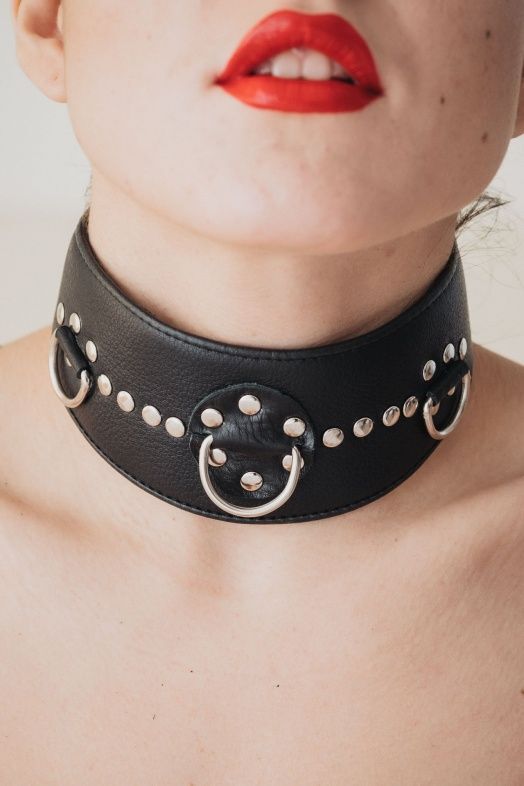 Ошейник с расширением впереди выполнен из качественной натуральной черной кожи, мягкий и комфортный в использовании. На изделии находятся три сварных полукольца. Аксессуар декорирован металлическими заклепками. Ошейник фиксируется металлическими кнопками, позволяющими подобрать нужный размер, подойдет на обхват шеи от 30 до 36 см. Стильный аксессуар поможет воплотить эротические фантазии в реальность. Ширина - 6 см.