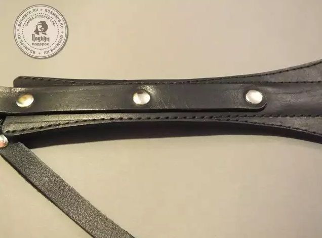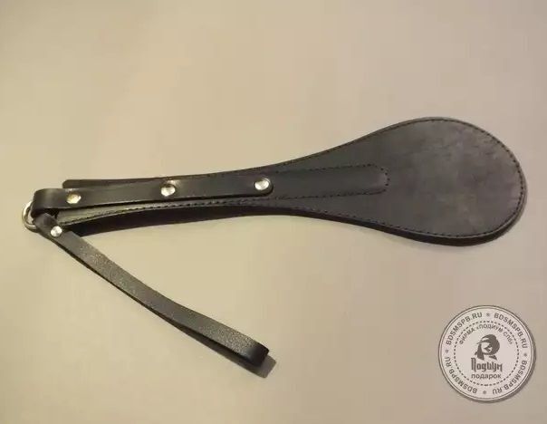 Фигурная хлопушка из натуральной кожи черного цвета. Используется для работы по ягодицам и по верхним мышцам внутренней стороны бедра. Проста в применении и безопасна. Во избежании травм не рекомендуется наносить удары ребром. Ручная работа. К рукояти прикреплена петля, позволяющая надежно фиксировать хлопушку в руке.