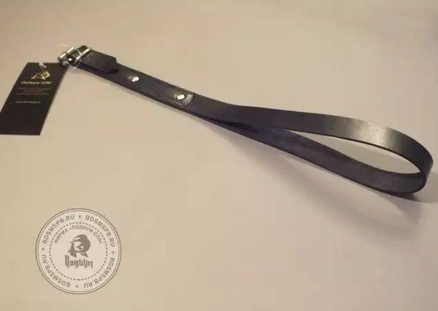 Мягкий спанкер выполнен из черной матовой кожи в виде ремня. Ручка украшена пряжкой. Используется для работы по ягодицам и по верхним мышцам внутренней стороны бедра. Прост в применении и безопасен. Во избежании травм не рекомендуется наносить удары ребром. Ручная работа. Ширина - 2,5 см. Длина ударной части - 26 см.