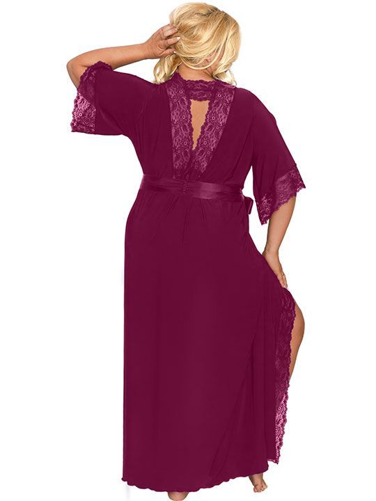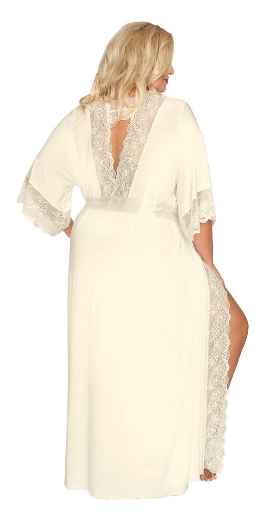 Длинный пеньюар. Глубокий вырез на груди и низ коротких рукавов декорированы изящным кружевом. Спинка с глубоким V-образным декольте декорирована кружевом. Широкий атласный пояс в комплекте.