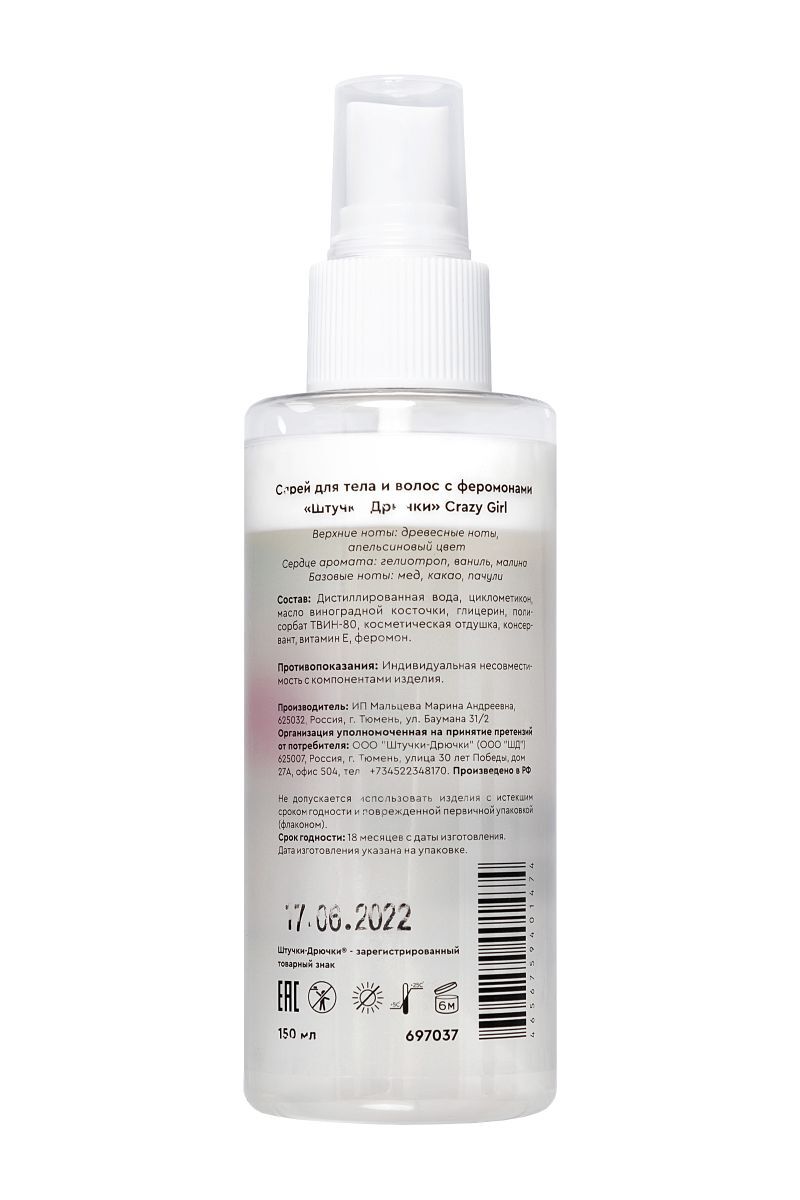 Спрей для смелых девушек Crazy Girl – это уверенность в себе, легкость и игривость каждый день. Секрет отличного настроения и магнетизма – двухфазный многокомпонентный спрей Crazy Girl, который содержит феромон, известный своим воздействием не только на противоположный пол. Феромон вызывает симпатию и всплеск интереса. Будь свободна в своих проявлениях, будь собой. Освежающий спрей для тела и волос содержит парфюмерную композицию. Искушающий, но ненавязчивый аромат завораживает ванилью, малиной и медом, звучащие ноты какао и апельсина не оставляют шансов остаться без внимания. Витамин Е и масло виноградной косточки в составе защищают, смягчают и увлажняют кожу, а волосы становятся шелковистыми и сияющими. Верхние ноты – древесные ноты, апельсиновый цвет Сердце аромата – гелиотроп, ваниль, малина Базовые ноты – мед, какао, пачули