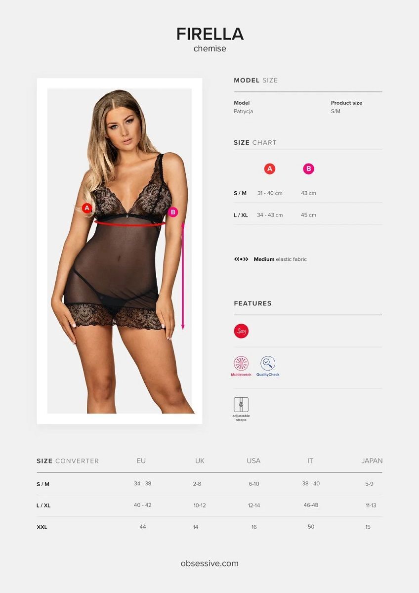 Сорочка Firella выполнена из полупрозрачной сеточки в сочетании с оригинальным кружевом. Чашки мягкие без косточек. Бретели регулируются по длине. В комплекте: сорочка и трусики-стринги.