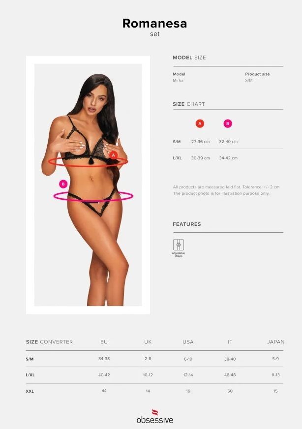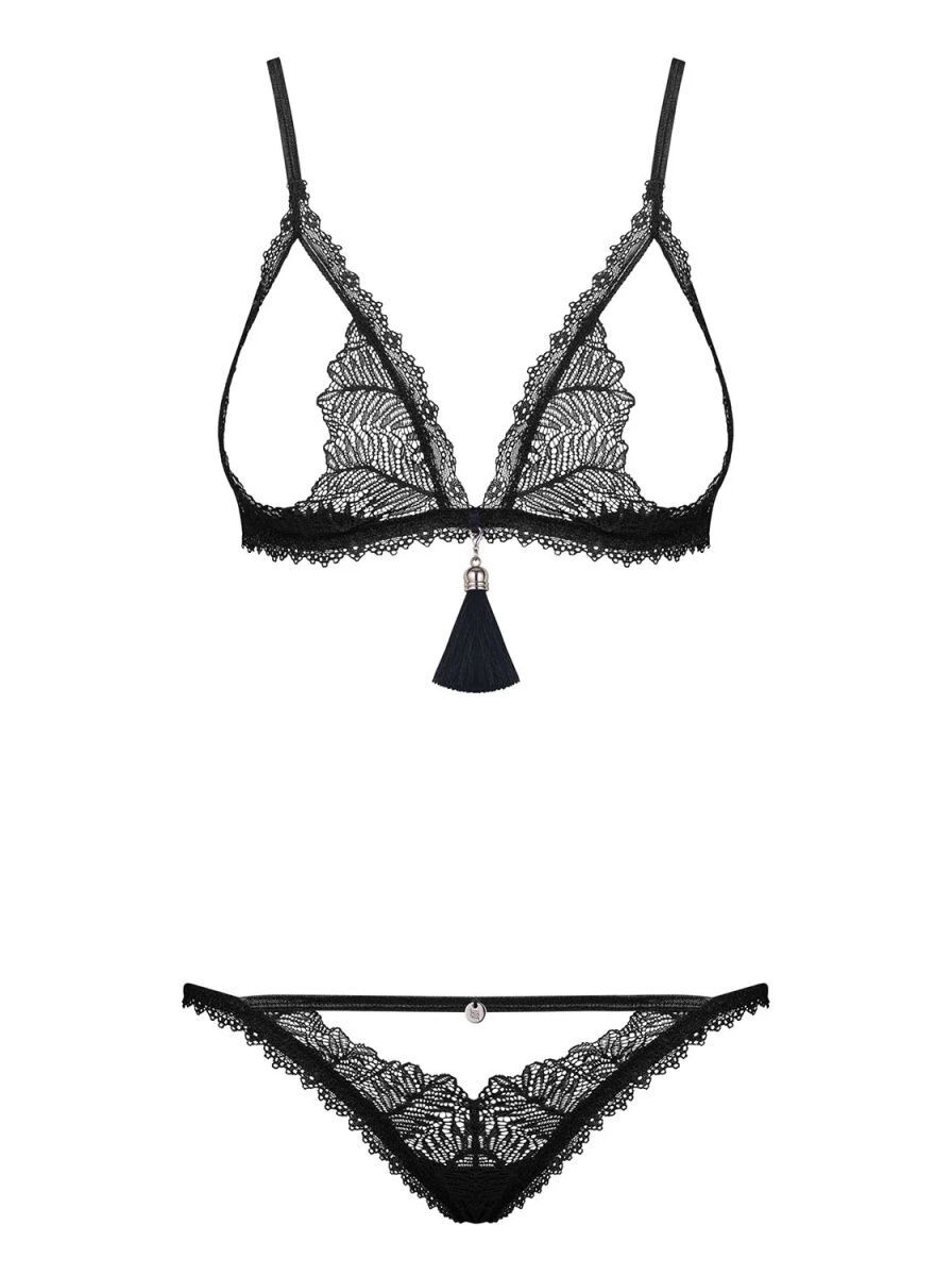 Игривый комплект Romanesa состоит из бюстгальтера и стрингов. Лиф с открытыми кружевными чашками, украшен съемной бахромой. Бретели регулируются по длине, на спинке удобная застежка. Необычайно пикантный, откровенный крой, нежное кружево - в этом комплекте вы будете выглядеть божественно. Комплект упакован в плотную красивую коробку и отлично подойдет в качестве оригинального подарка. В комплекте: лиф, трусики-стринги.