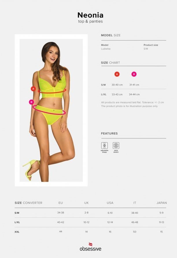 Оригинальный крой комплекта Neonia и застежка-молния привлечет ваше внимание. Комплект выполнен из приятной к телу, нежной эластичной ткани, облегающей тело. Регулируемые бретели. В комплекте: топ, трусики.
