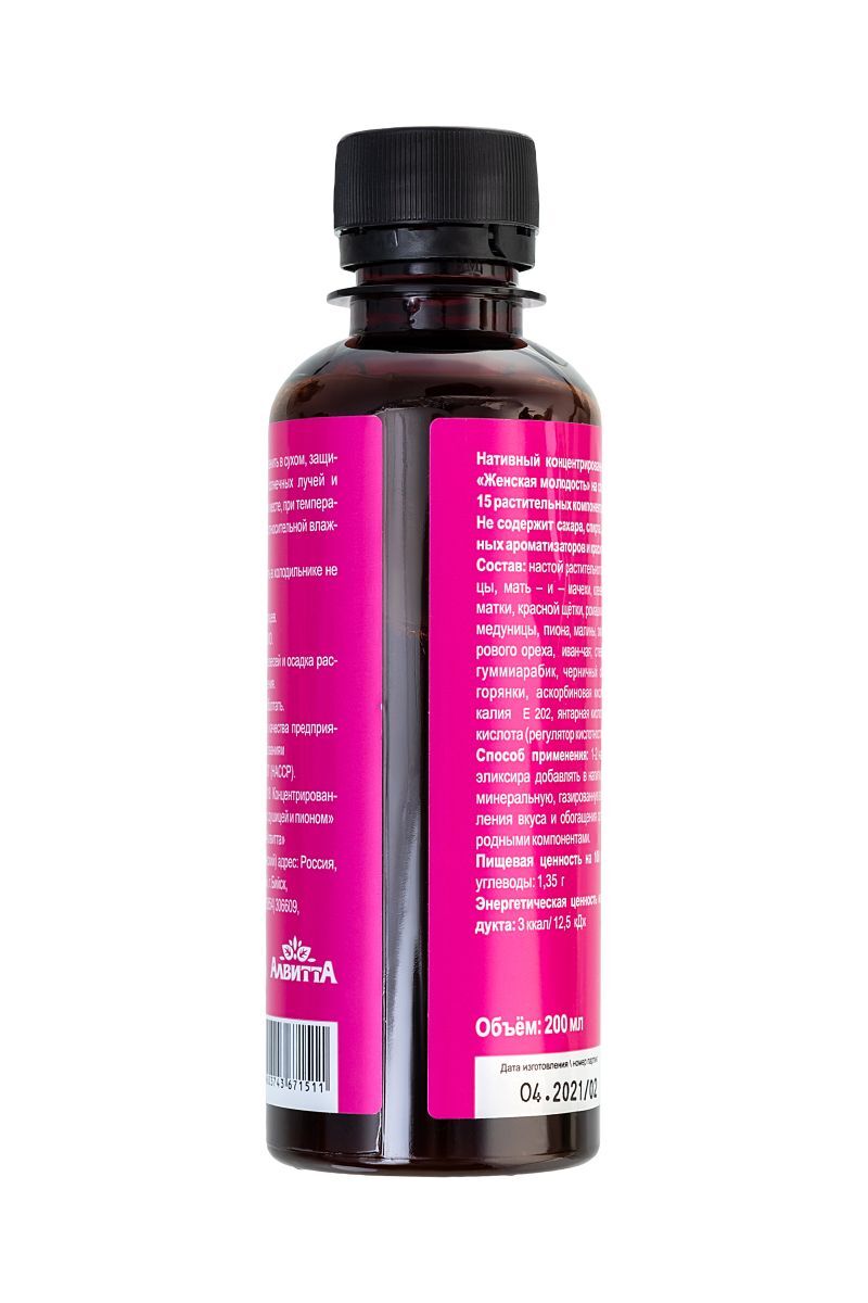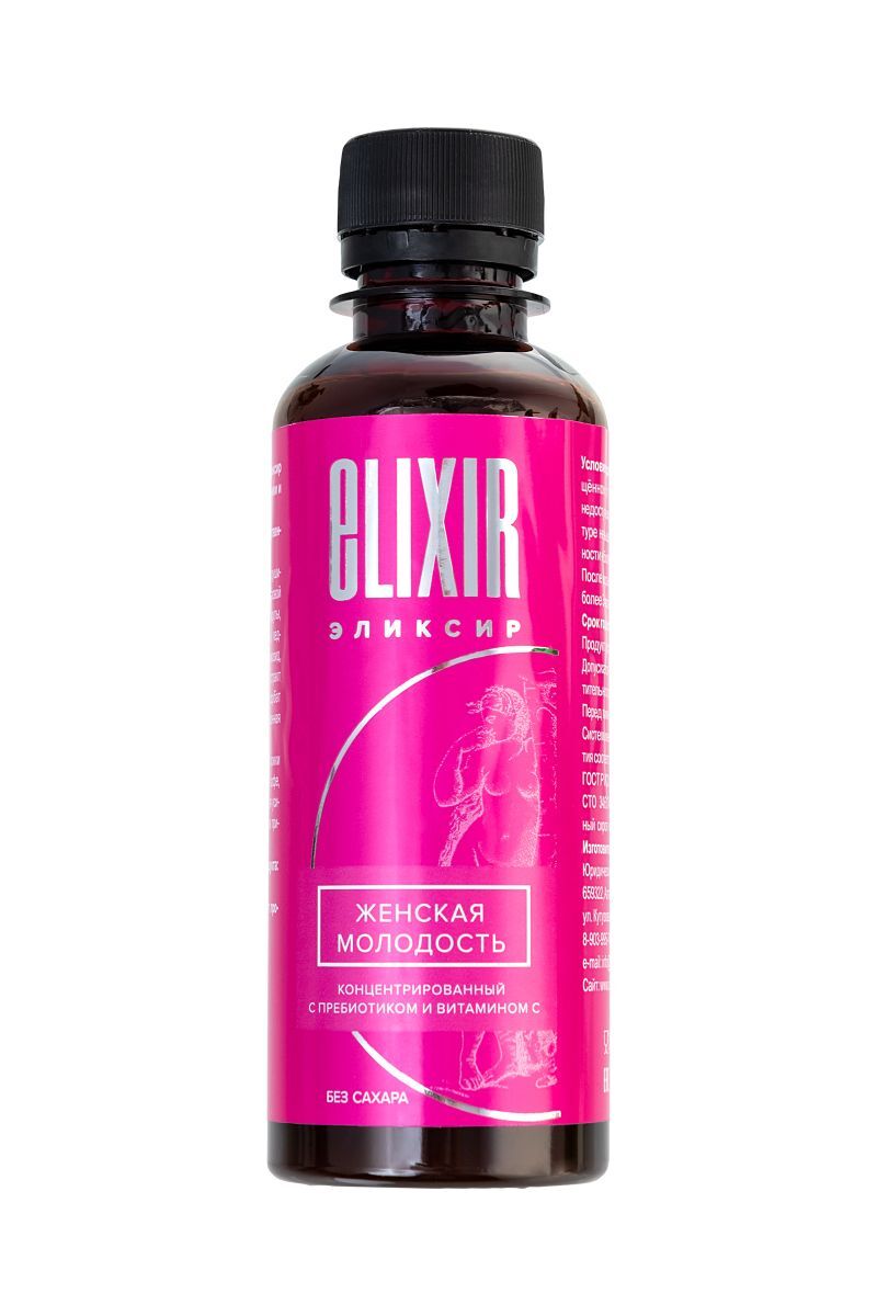 Концентрированный эликсир «Женской молодости» на соке черники из 15 растительных компонентов - это уникальное оздоровительное природное средство. Активные вещества, содержащиеся в эликсире, способствуют: регуляции гормонального баланса, снижению климактерических проявлений активации иммунной системы, улучшению функций эндокринной системы и состава крови, повышению умственной и физической работоспособности, усилению антиоксидантной защиты организма, замедляя старение клеток. Не содержит сахара, спирта, искусственных ароматизаторов и красителей.