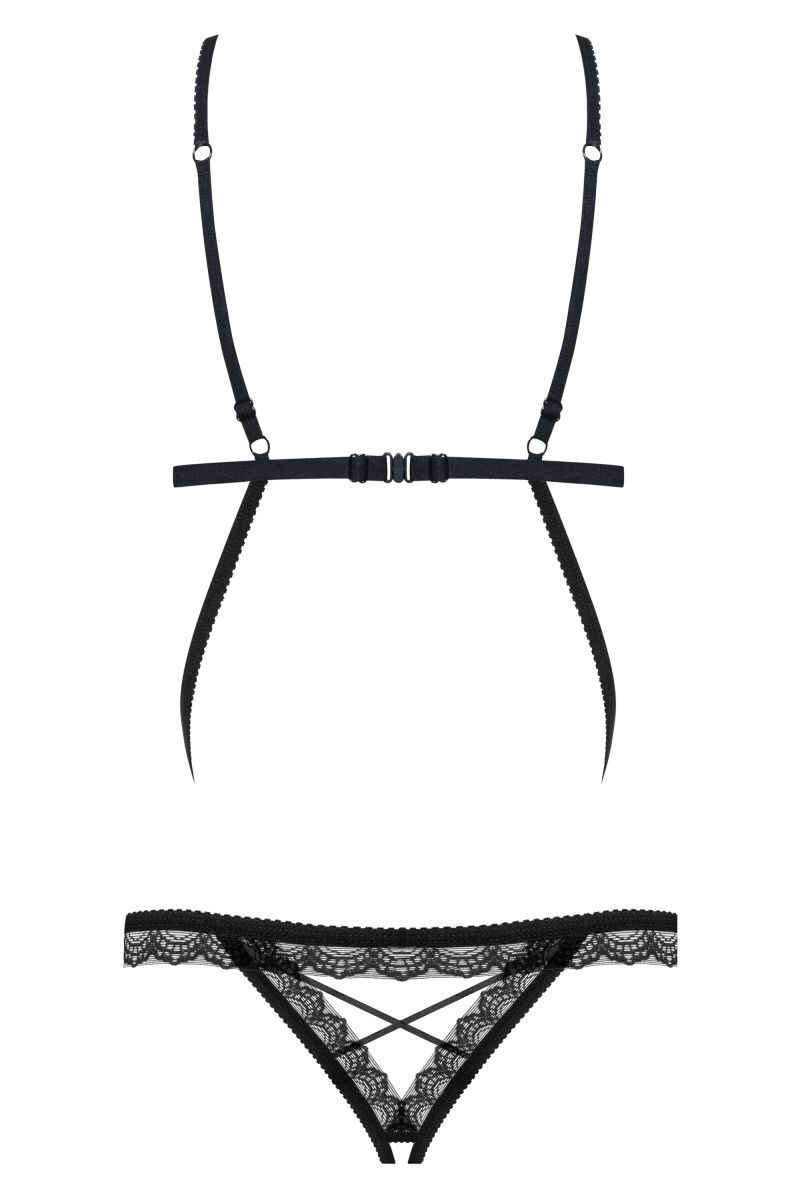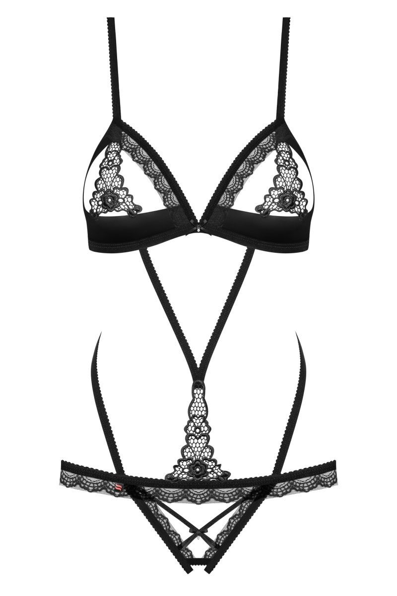 Оригинальное контактное боди. Открытый лиф декорирован вставкой из кружева, бретели регулируются. Верхняя и нижняя часть боди соединена тонкими резиночками-стрепами.