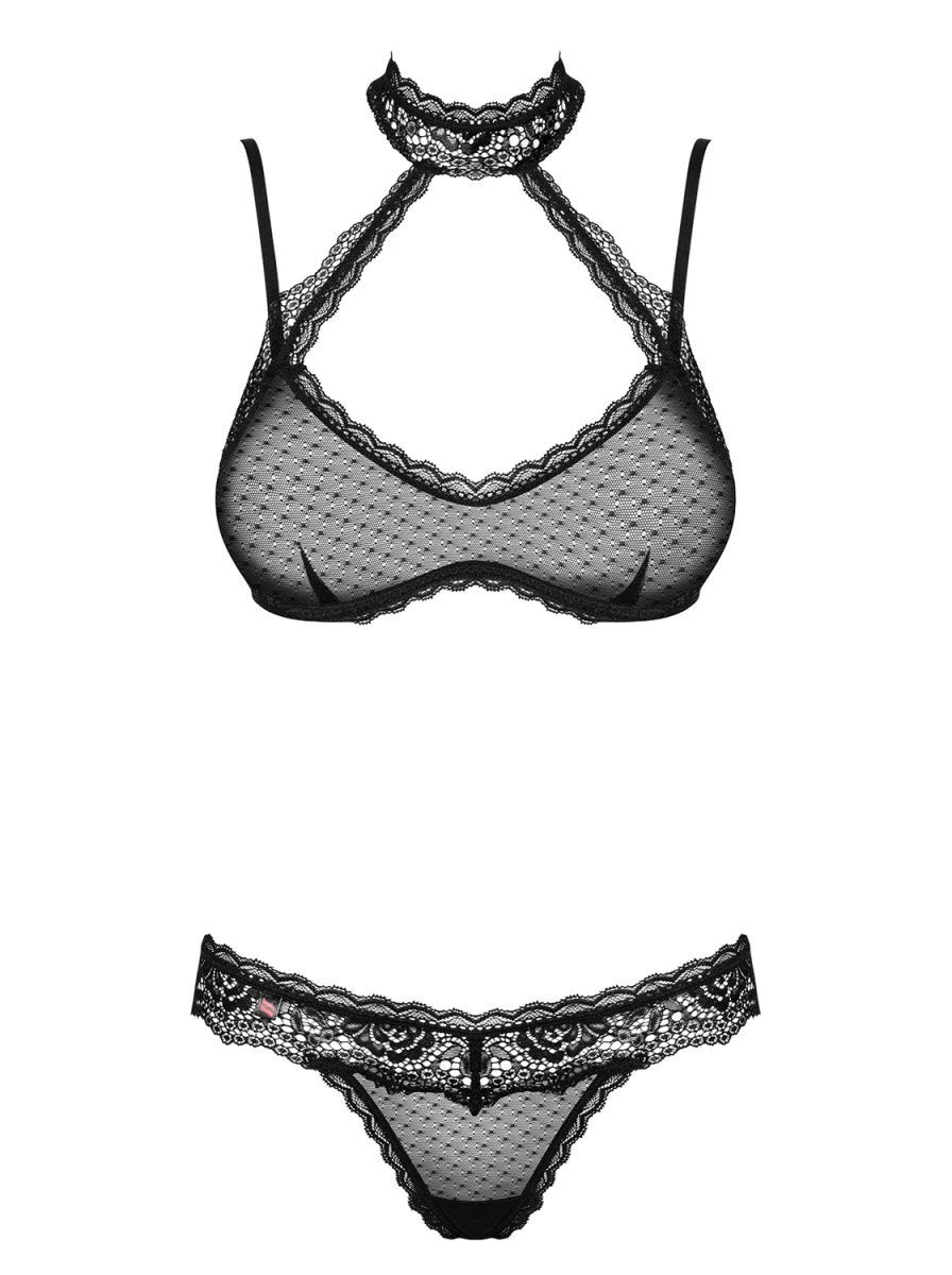Эротичный комплект белья из двух предметов. Изготовлен из прозрачного тюля с геометрическим узором в крапинку. Бра с мягкими чашечками на косточках поддерживает грудь. Кружевное украшение-чокер декорировано пуговками с жемчужинами сзади. Бретели регулируются по длине, сзади застежка на несколько рядов крючков для наилучшей посадки по фигуре. Игривые стринги с узорчатым кружевом идеально дополняют бра. В комплекте: бра, трусики.