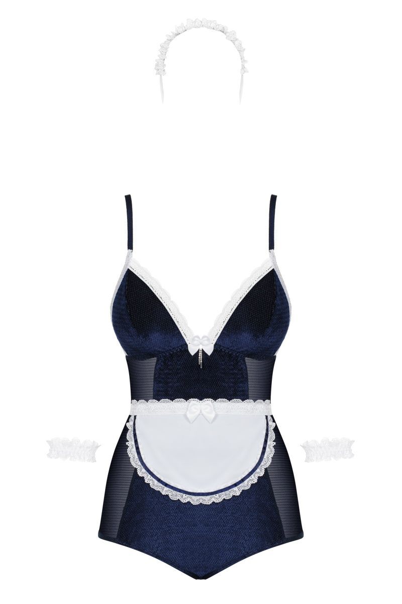Эротическое боди Maid выполнено из нежного бархата и полупрозрачных вставок по бокам. Лиф на тонком поролоне без косточек, бретельки регулируются по длине. В комплекте: боди, фартук, чепец и аксессуары на запястья.