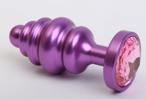 Фиолетовая ребристая анальная пробка с розовым кристаллом - 7,3 см.