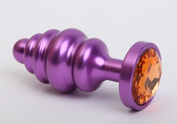 Фиолетовая ребристая анальная пробка с жёлтым кристаллом - 7,3 см.