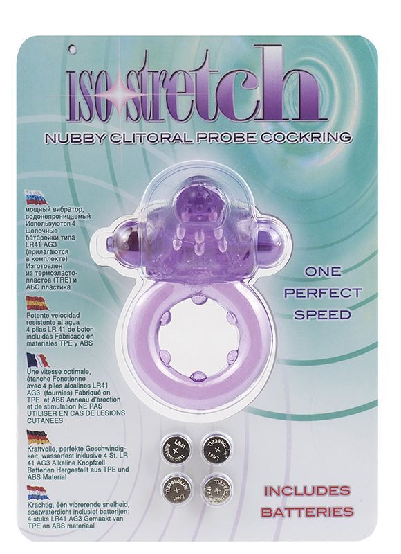 Фиолетовое эрекционное кольцо с вибрацией и рельефным язычком NUBBY CLITORAL PROBE COCKRING. Батарейки в комплекте (4хLR41).