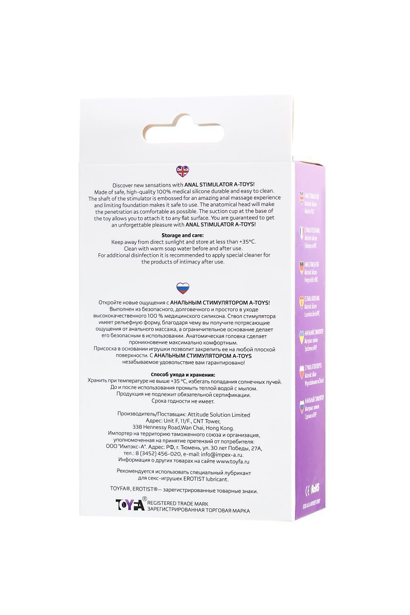 Откройте новые ощущения с анальным стимулятором A-Toys! Она выполнена из безопасного, долговечного и простого в уходе высококачественного 100 % медицинского силикона. Ствол стимулятора имеет рельефную форму, благодаря чему вы получите потрясающие ощущения от анального массажа, а ограничительное основание делает ее безопасной в использовании. Анатомическая головка сделает проникновение максимально комфортным. Присоска в основании игрушки позволит закрепить ее на любой плоской поверхности. С анальным стимулятором A-Toys незабываемое удовольствие вам гарантировано! Рабочая длина – 11,5 см.