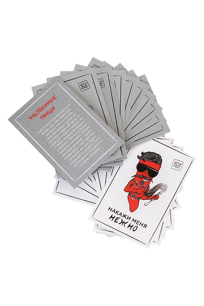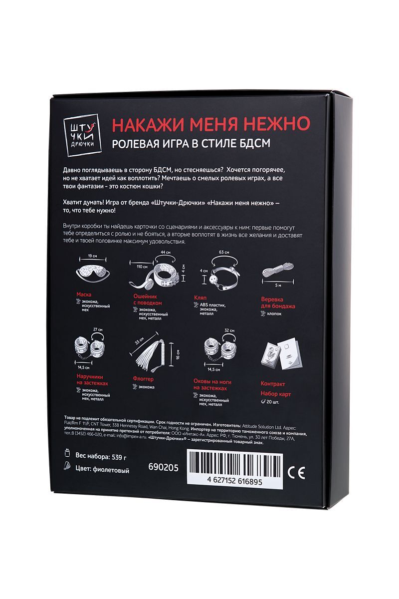 Игра «Накажи меня нежно» — то, что нужно, если вы давно поглядываете в сторону БДСМ, но стесняетесь. Если хочется добавить огня в секс, но не хватет идей. Игра в стиле БДСМ от «Штучек-Дрючек» для тех, кто мечтает о смелых ролевых играх, когда все фантазии сводятся к костюму супергероя или кошечки. Внутри коробки все, что нужно для первого знакомства с БДСМ: карточки со сценариями и аксессуары к ним. Первые помогут определиться с ролью и не бояться, а вторые воплотят в жизнь все желания и доставят максимум удовольствия. Вам понравится, обещаем! В комплекте: наручники, оковы, ошейник с поводком, кляп-шарик, плеть, веревка для связывания, маска на глаза, набор карт, контракт. Длина маски - 19 см. Длина ошейника с поводком - 110 см., диаметр ошейника - 44 см., ширина - 4 см. Длина кляпа - 63 см., диаметр шарика - 4 см. Длина веревки - 500 см. Длина хвостов плети - 33 см., ручки - 16 см. Длина металлической сцепки наручников - 14,5 см., диаметр наручников - 27 см. Длина металлической сцепки оков - 14,5 см., диаметр оков - 32 см.