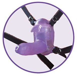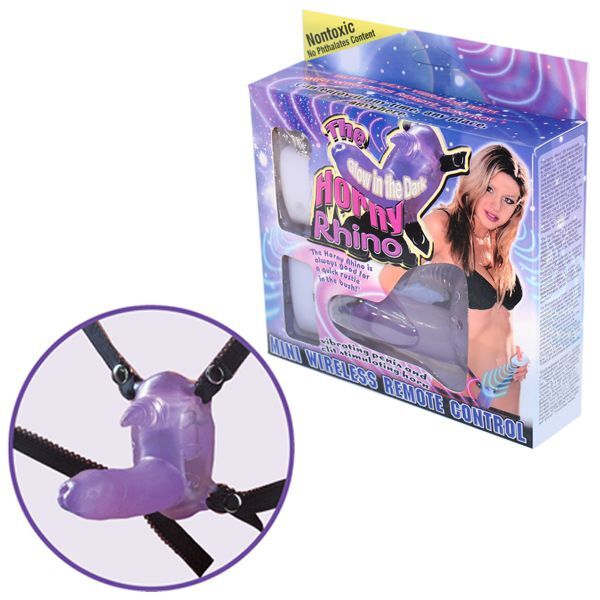Фиолетовый вибростимулятор в виде рога носорога на регулируемых трусиках и с пультом ДУ. Эластичные ремешки гарантируют плотное облегание тела. Стимулятор с рогом для клиторального воздействия и фаллосом для вагинального массажа светится в темноте. Для работы требуется 6 батареек типа LR44 (нет в комплекте). Длина фаллоса - 8 см. Дальность действия пульта - 15 метров.
