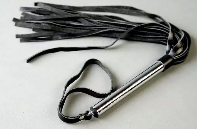 Плеть узкая, ручка металлическая, короткая. Стильная плеть ручной работы имеет короткий хвост, состоящий из тридцати полос мягкой кожи. К узкой металлической ручке прикреплена петля, позволяющая надежно фиксировать плеть в руке. Длина ручки - 15,5 см.