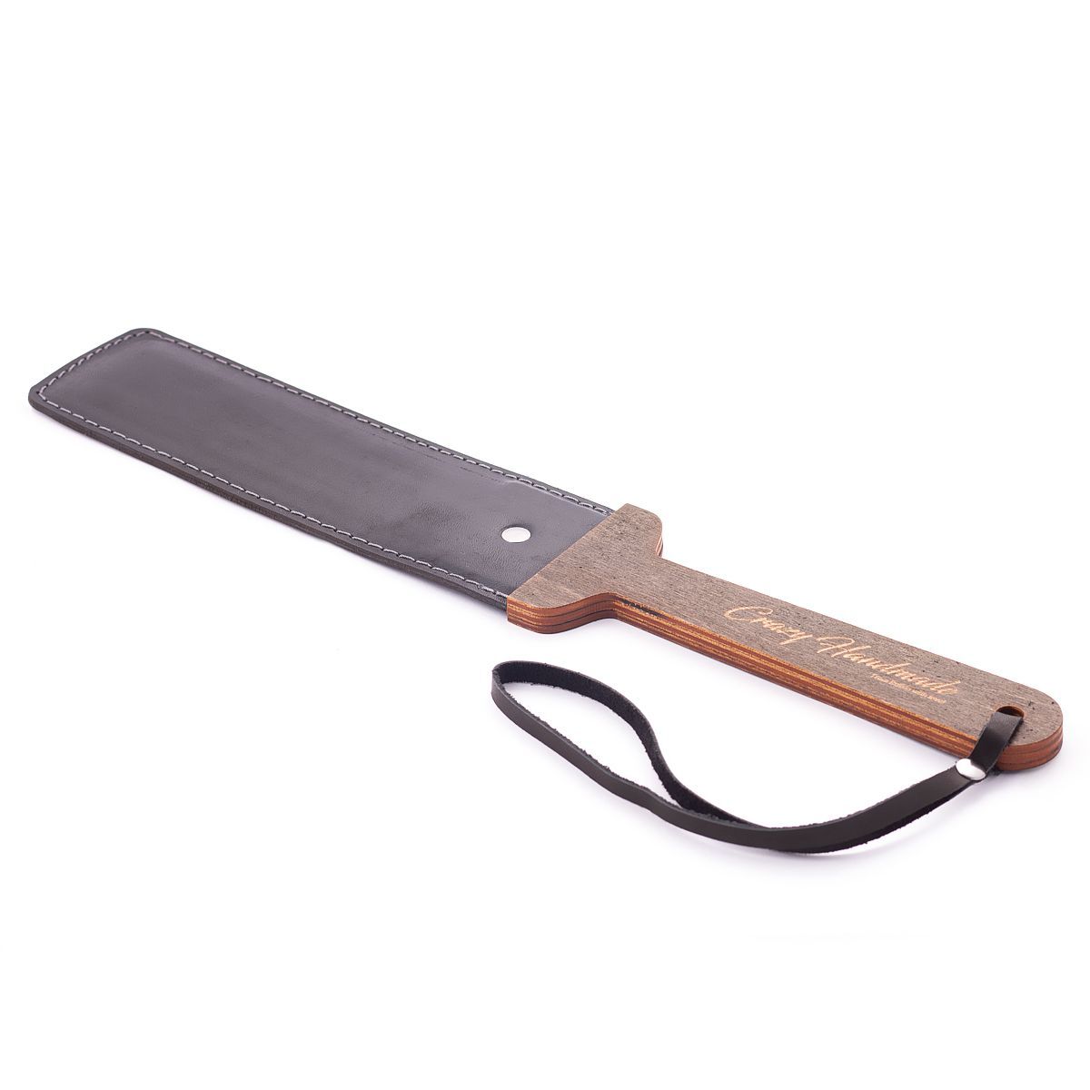 Гибкий пэддл из натуральной кожи и дерева. Длина ударной части - 20 см. Ширина - 6,5 см.