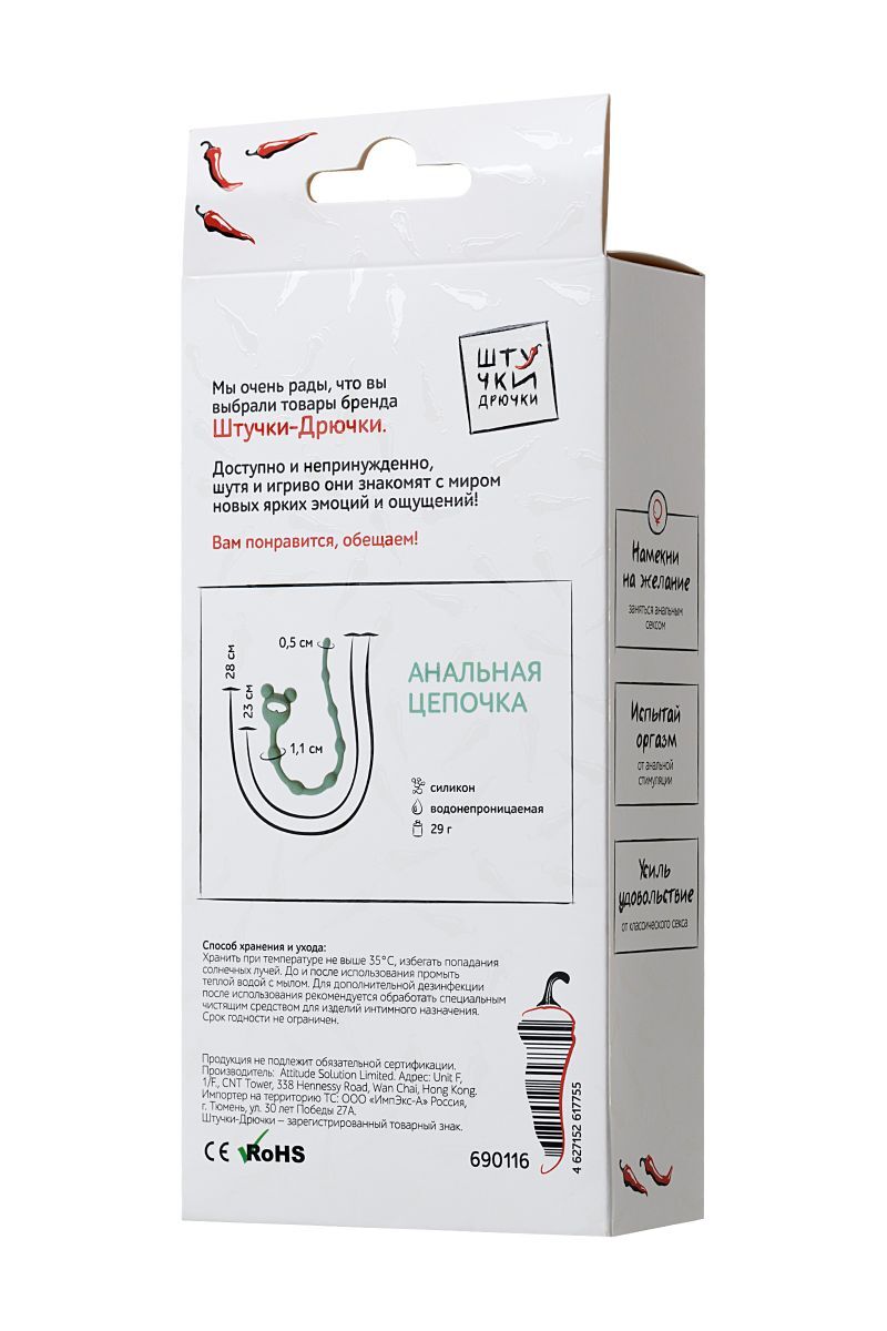 Штучка для другого входа. Подготовка к анальному сексу. Усиль удовольствие от классического секса. Испытай оргазм от анальной стимуляции. Эта анальная цепочка создана для непередаваемых эмоции во время интимнои близости. Длина цепочки за счет разделительных звеньев не напугает новичка и порадует опытного любителя пикантных ощущении. Ожерелье постепенно увеличивающихся в диаметре «горошин» приятно массирует и дарит совершенно особенное удовольствие. За счет элегантного хвостика-ушастика его комфортно вводить и извлекать без всяких затруднении. ? Цепочка выполнена из гипоаллергенного силикона, прекрасно совместимого с лубрикантом на воднои основе. Рабочая длина - 23 см. Минимальный диаметр - 0,5 см.